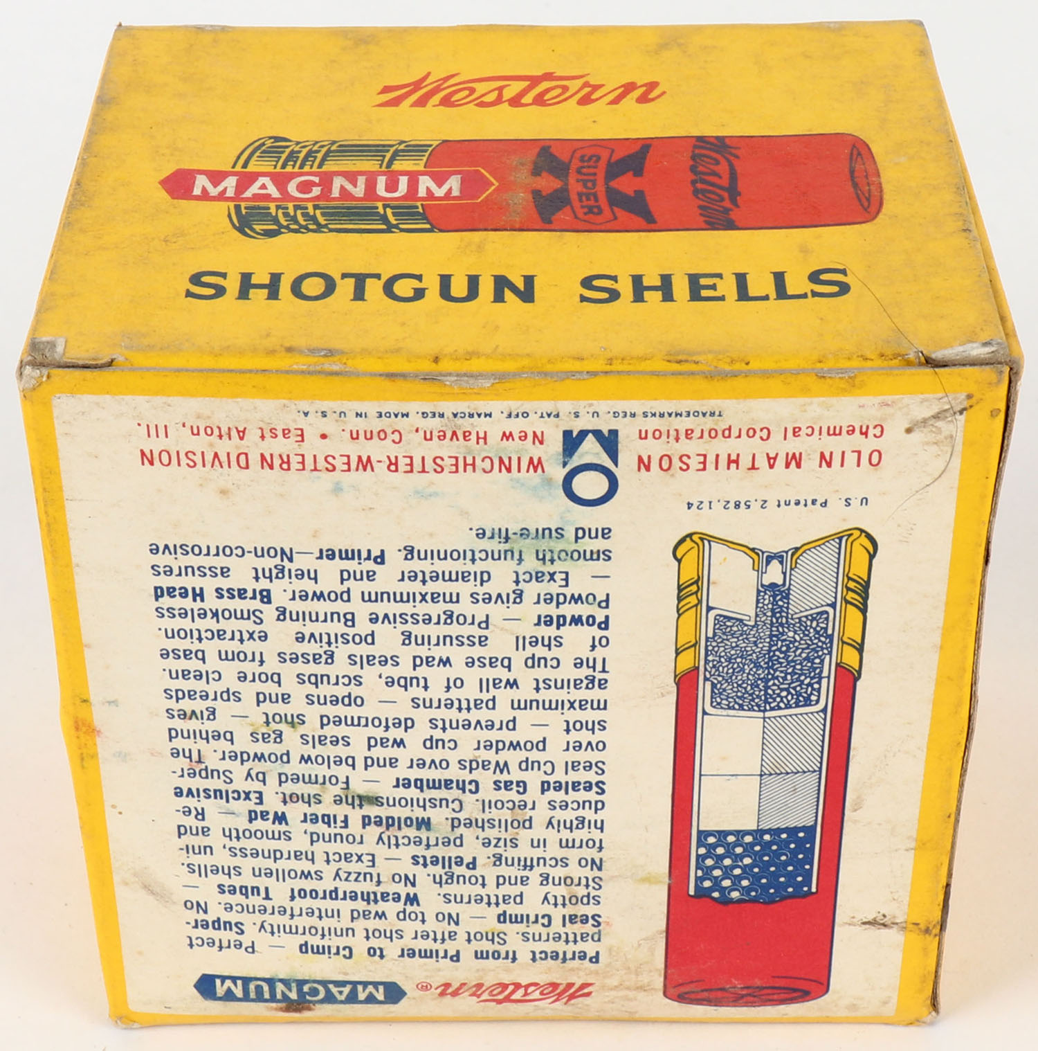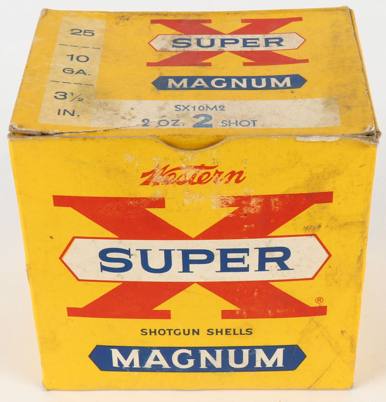 Western, Super X Magnum, 10ga., 3 1/2'', 1pc., Partial 22 rds., shot size 2, yellow, blue & red box, box is very solid with light scuffing, box has great colors, shells are excellent. Grade: Very Good ++ - Value: 10 to 40
