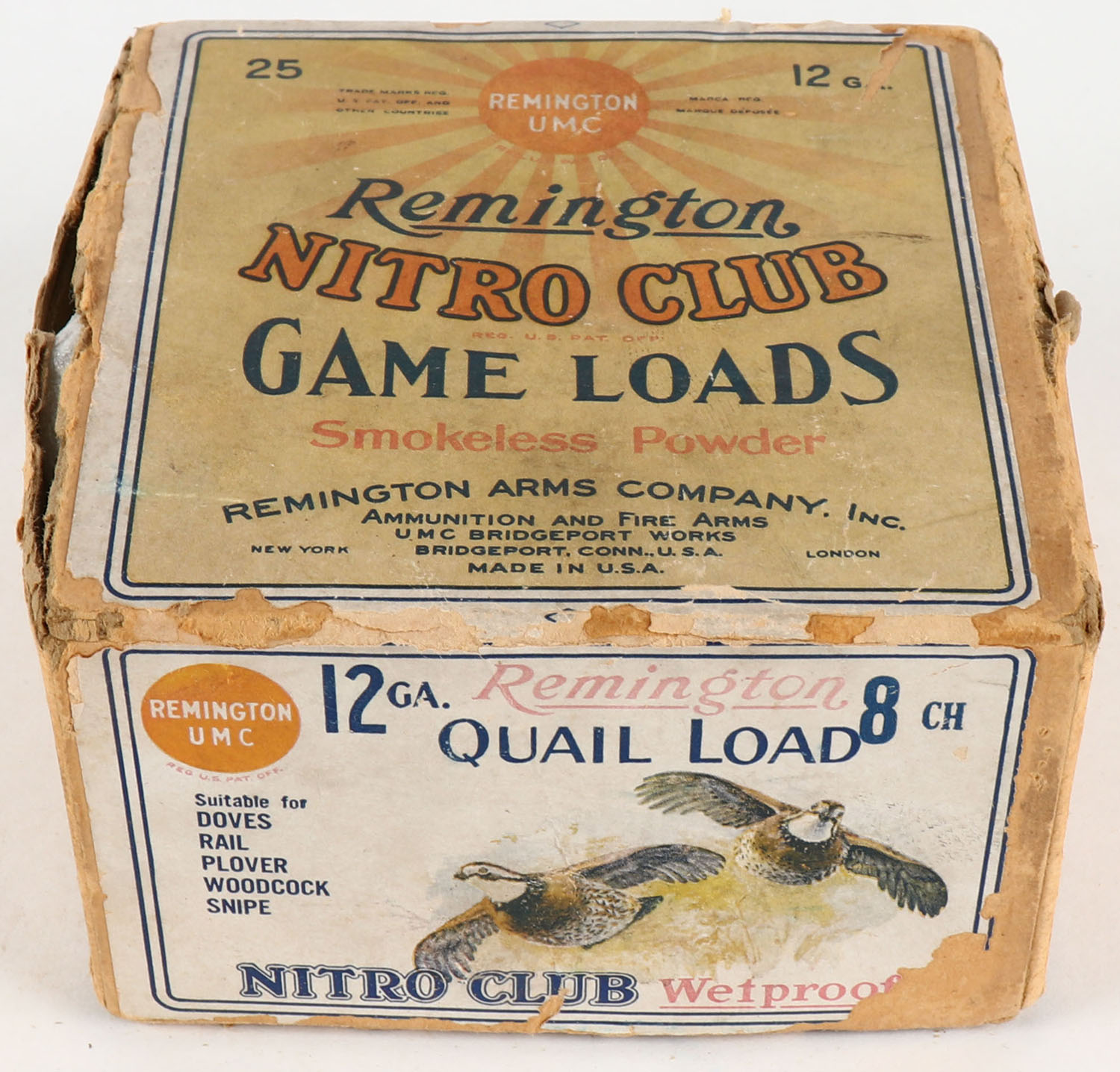 Remington UMC Nitro Club, GAME LOADS, QUAIL LOAD, 12ga., 2pc., Partial 21rds., shot size 8 CH, buff box with sunburst logo & QUAIL in flight on side, box has age soiling with edge wear, box has a seam split, paper shells are very good. Grade: Very Good - Value: 100 to 600