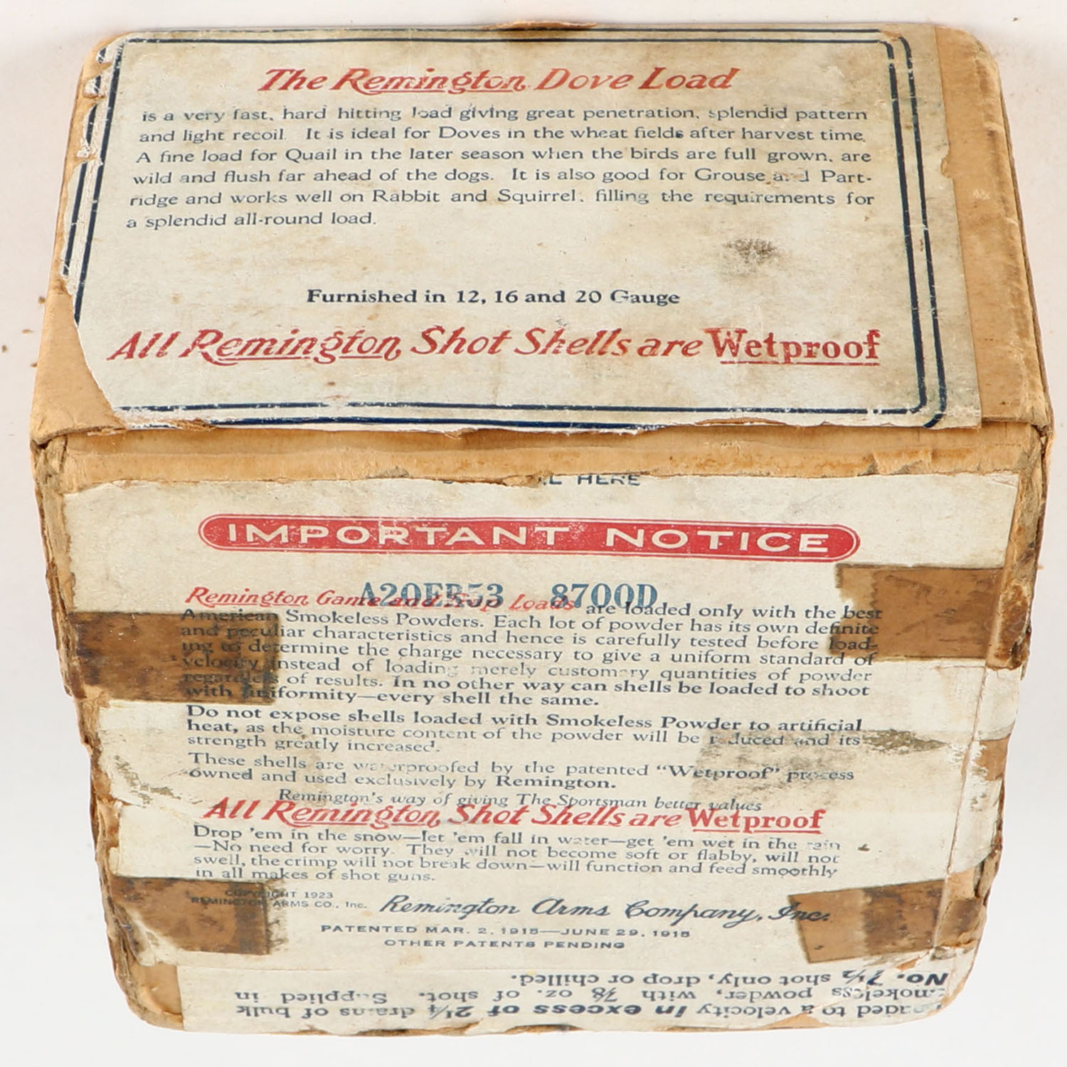 Remington UMC Nitro Club, GAME LOADS, DOVE LOAD, 20ga., 2pc., Full, shot size 7 1/2, buff box with sunburst logo & DOVE on side, box has repaired seam splits, box has age soiling & scuffing, paper shells are very good. Grade: Very Good - Value: 100 to 600
