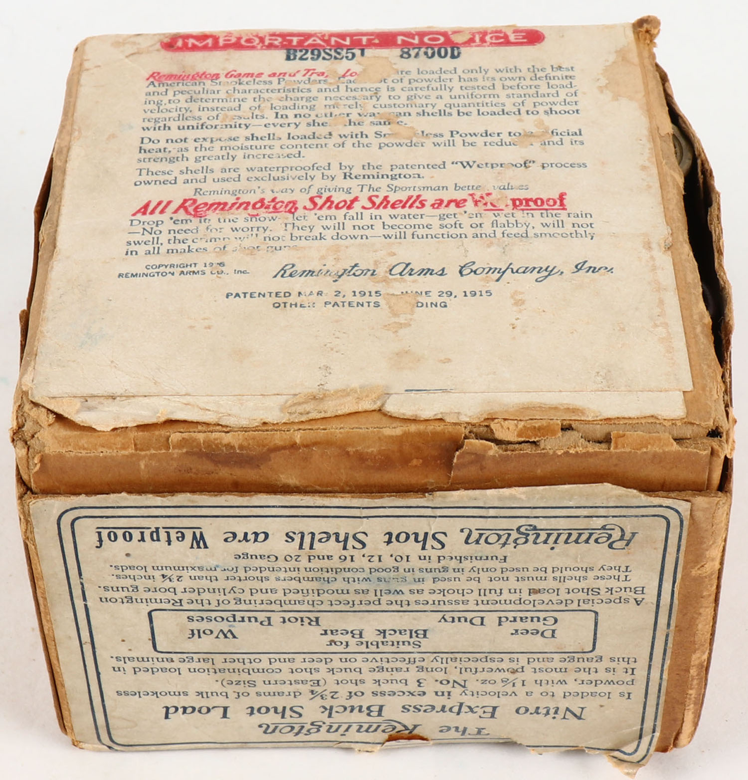 Remington UMC Nitro Express, Long Range Game Loads, pictures Buck jumping, 20ga., 2pc., Partial 23rds., shot size 3 BUCK, buff box with sunburst logo & BUCK on side, box has seam splits with edge wear, scuffing and soiling, paper shells are very good. Grade: Good - Value: 40 to 200