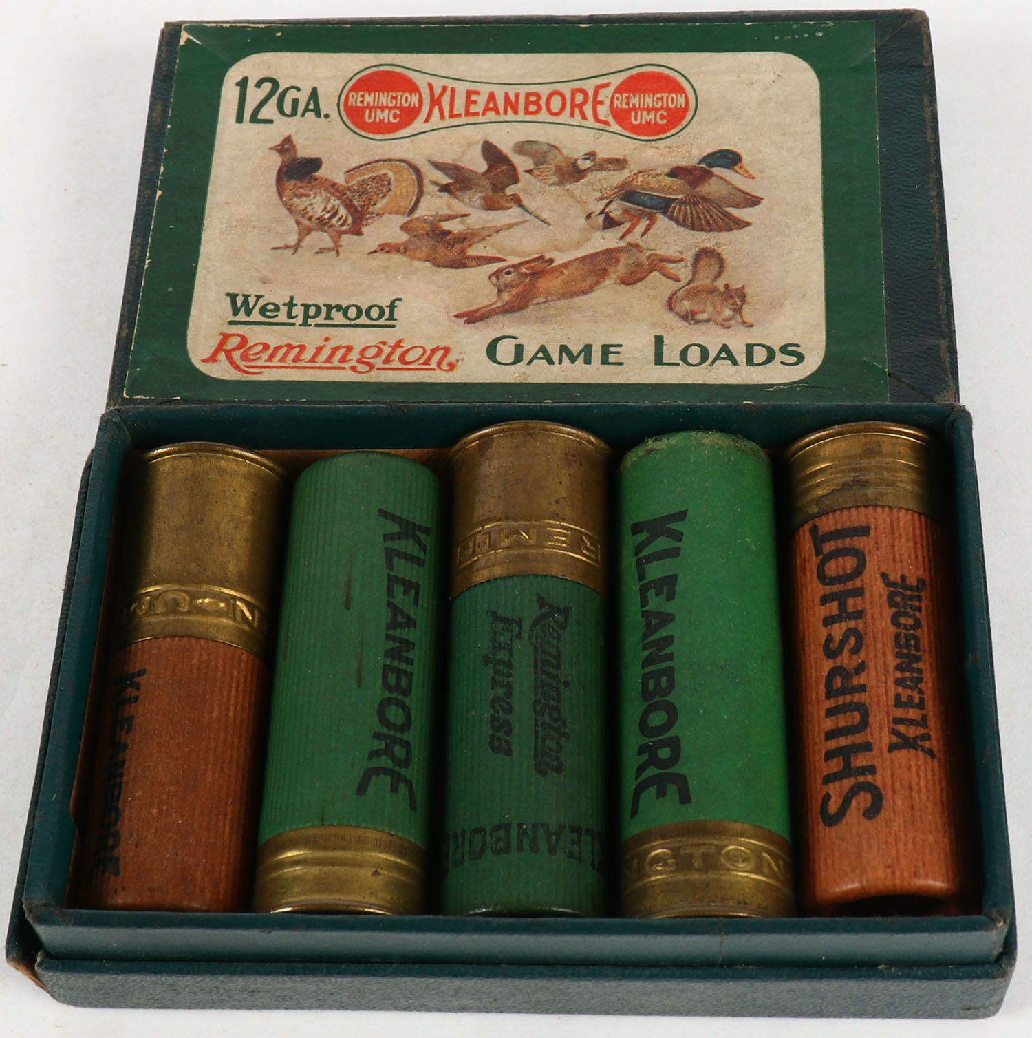 Remington UMC, Kleanbore, GAME LOADS, SALESMAN SAMPLE, 12ga., 2pc., Full with INCORRECT shells, green box with assortment of animals on top, box has light age soiling, shells are good. Grade: Very Good - Value: 40 to 100