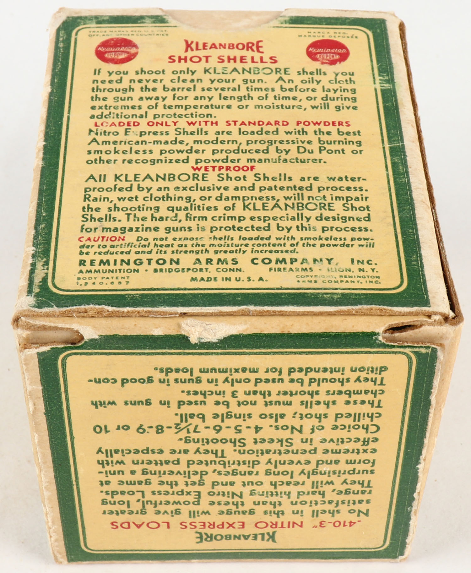 Remington, Kleanbore, NITRO EXPRESS, 410ga., 1pc., Full, shot size 5C, 3'', box is yellow, red and green, box has some edge wear, paper shells are good. Grade: Very Good - Value: 20 to 60
