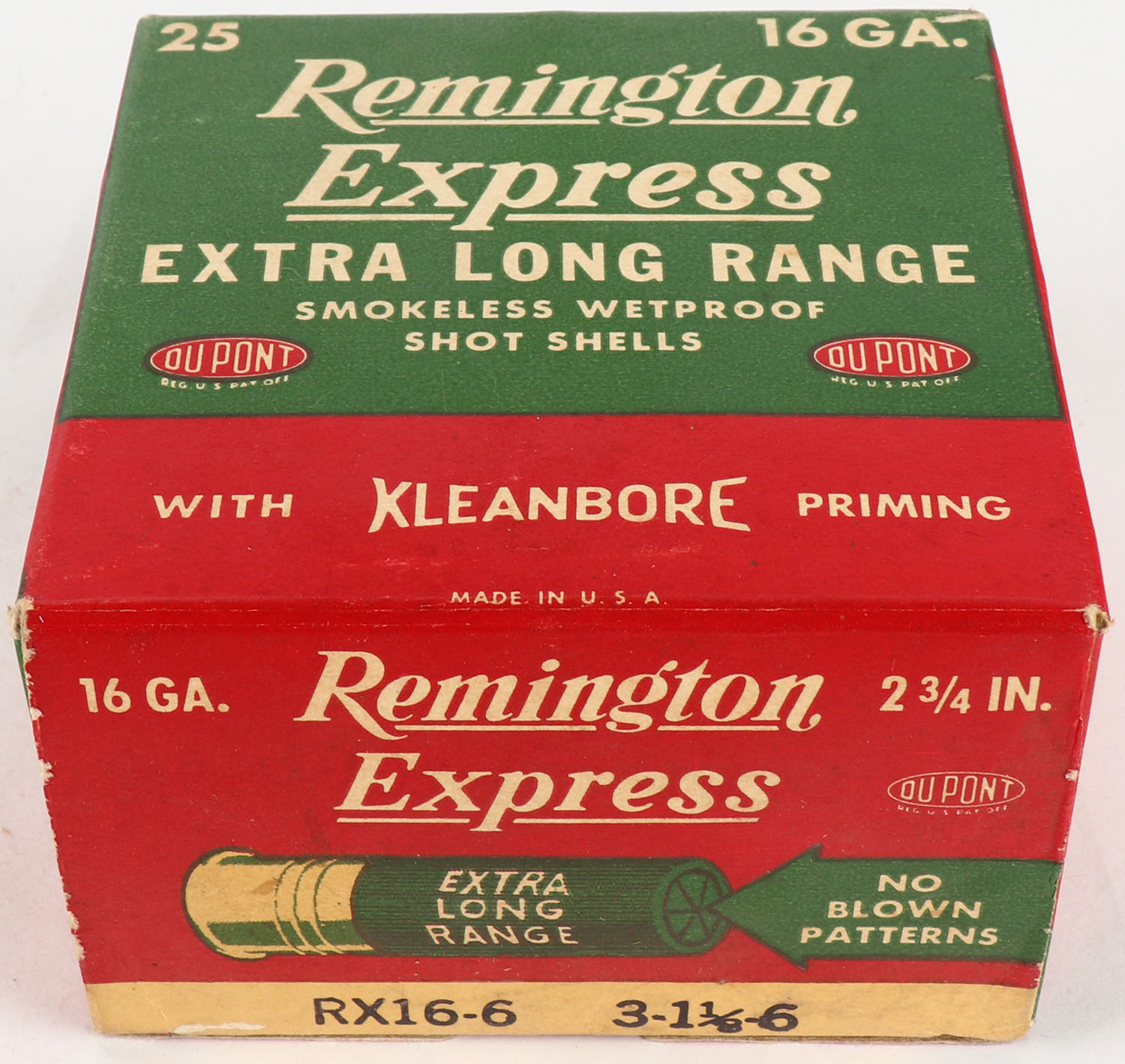 Remington Express, Extra Long Range, 16ga., 2 3/4'', 1pc., Full, shot size 6, box is red, green, and yellow, box is minty, shells are very good. Grade: Excellent + - Value: 10 to 30