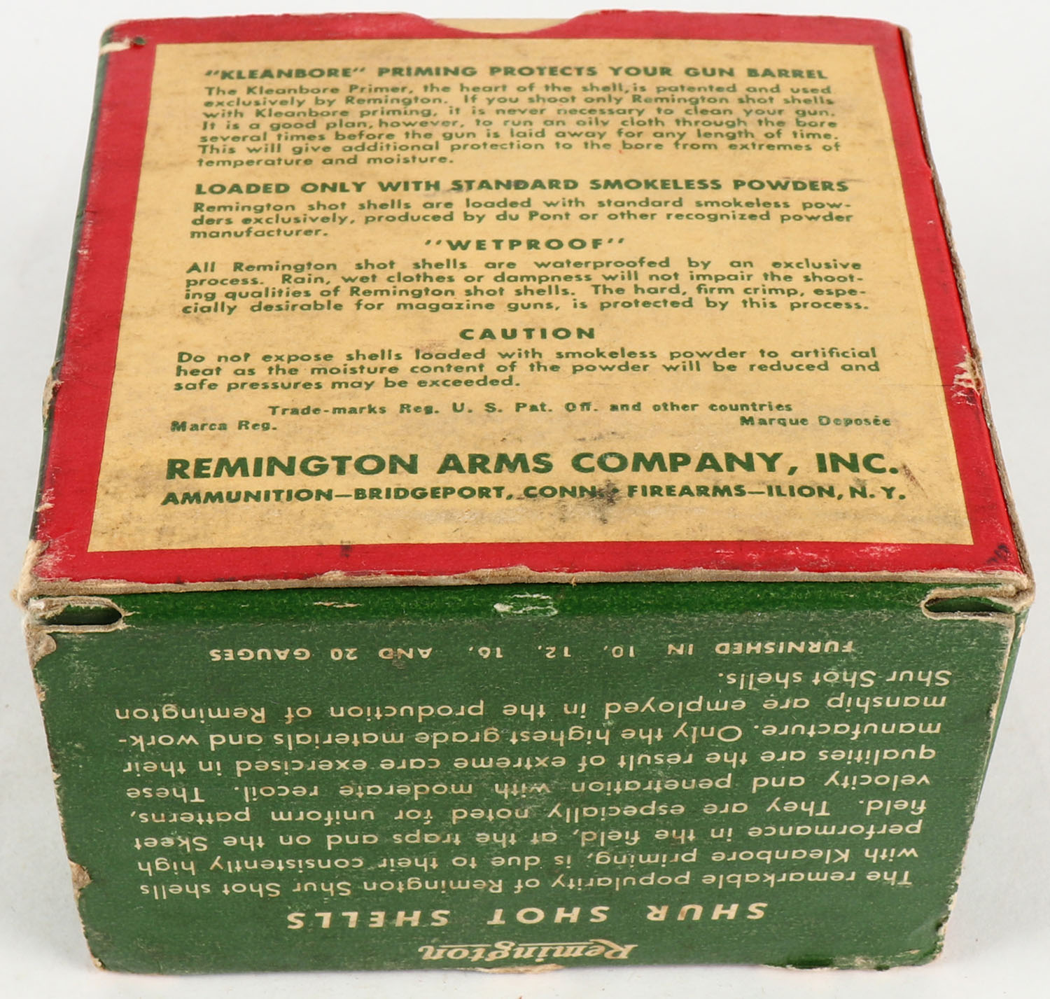 Remington Shur Shot, 16ga., 2 9/16'', 1pc., Full, shot size 5, box is white, yellow, red and green, box has light scuffing, paper shells are excellent. Grade: Excellent - Value: 10 to 40