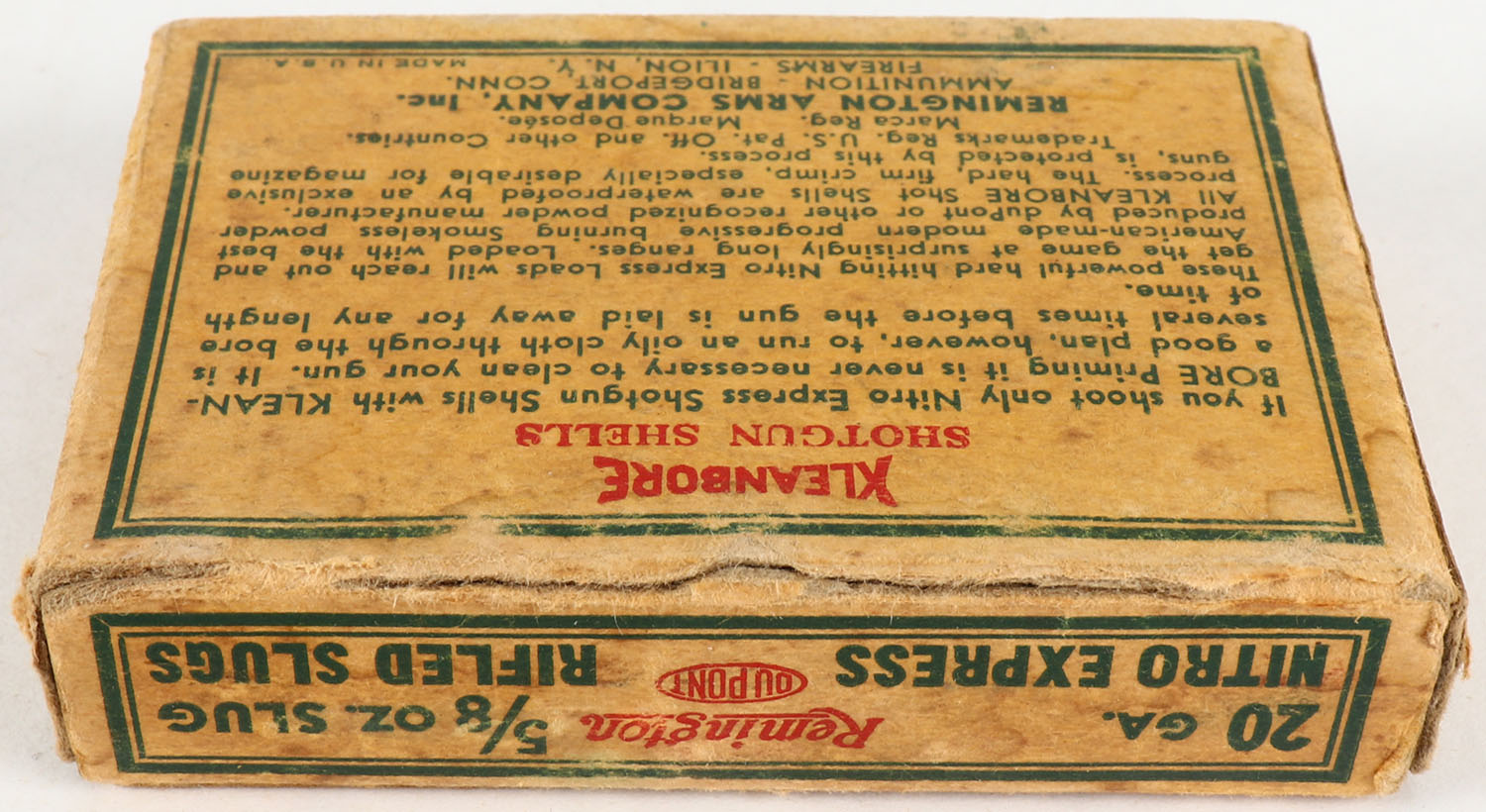 Remington, Kleanbore, NITRO EXPRESS, 20ga., 2 1/2'', 1pc., Full, shot size Rifled Slugs, box is buff, red and green, box is solid with scuffing, paper shells are good. Grade: Very Good - Value: 10 to 30