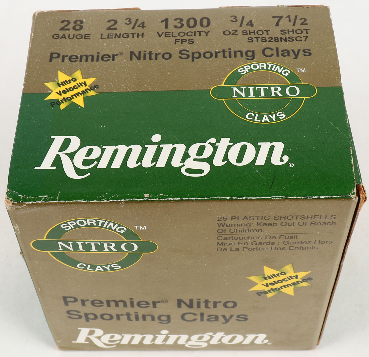 Remington, Premier Nitro Sporting Clays, 28ga., 2 3/4'', 1pc., Full, shot size 7 1/2, multi-colored box, box is very solid with great colors, plastic shells are excellent. Grade: Excellent ++ - Value: 10 to 40