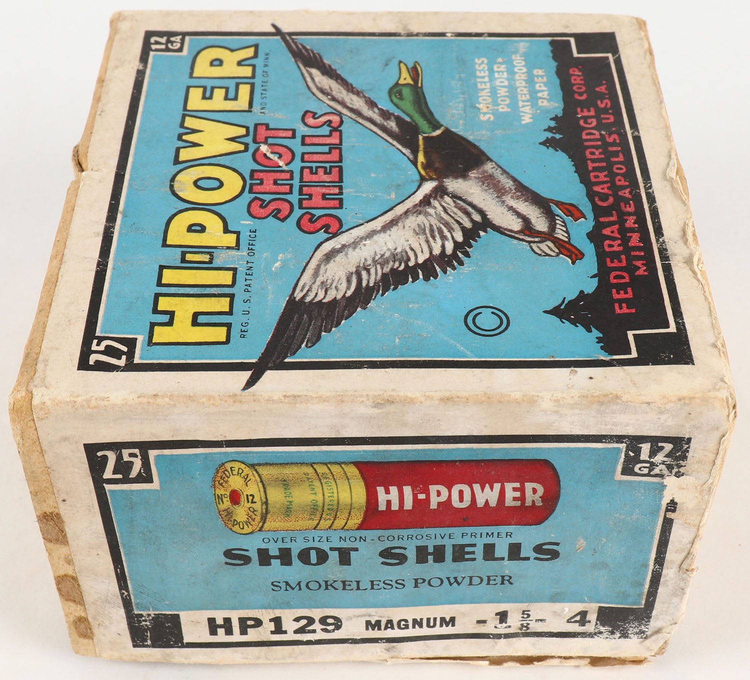 Federal Cart. Co., HI-POWER, 12ga., 2 PIECE!, Empty, shot size 4, buff box with multi colored label that pictures Mallard in flight, box has scuffing, light edge wear & light soiling with very nice label. Grade: Very Good ++ - Value: 40 to 200