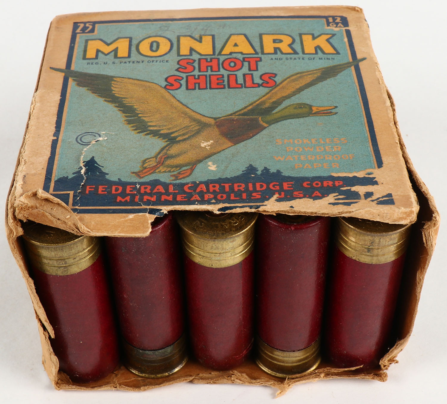 Federal Cart. Co., MONARK, 12ga., 1pc., Full, shot size 9 Skeet Load, Blue border, blue, yellow and red box with flying mallard, box has age soiling with a missing bottom flap, paper shells are excellent. Grade: Good - Value: 10 to 40