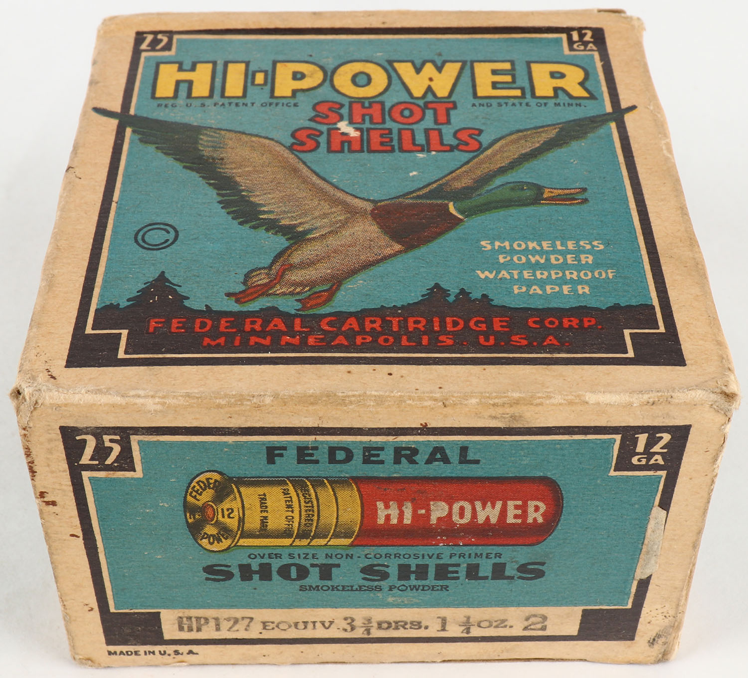 Federal Cart. Co., HI-POWER, 12ga., 1pc., Full, shot size 2, Black border, blue, yellow and red box with flying mallard, box is very solid with some age soiling, box has great colors, paper shells are very good. Grade: Very Good ++ - Value: 10 to 40