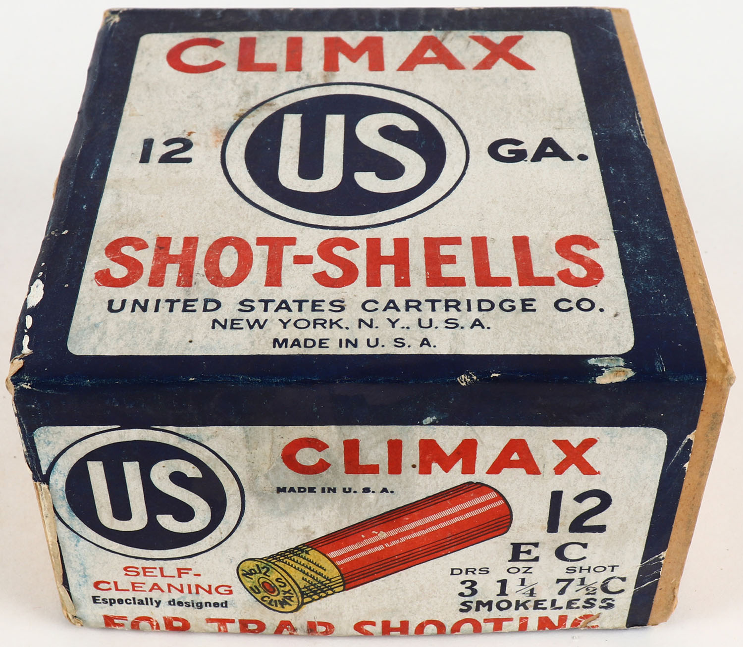 U.S. Cart. Co., New York, NY, CLIMAX, FOR TRAP SHOOTING, 12ga., 2pc., 3'', Empty, shot size 7 1/2C, buff box with white, red & blue paper label, box is very solid with excellent label, has light scuffing with light edge wear. Grade: Excellent + - Value: 20 to 100