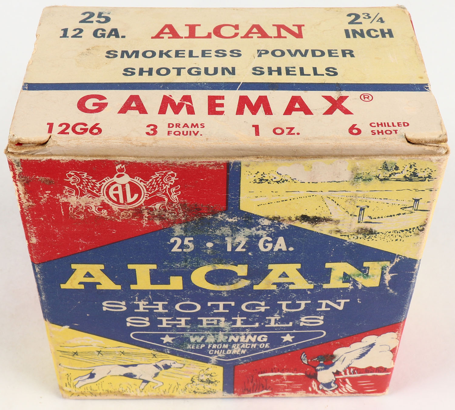 Alcan, Smokeless Powder, Gamemax, 12ga., 2 3/4'', 1pc., Partial with 18rds. Being correct, shot size 6CH, multi-colored box, box has scuffing with great colors, paper shells are excellent. Grade: Very Good + - Value: 10 to 30