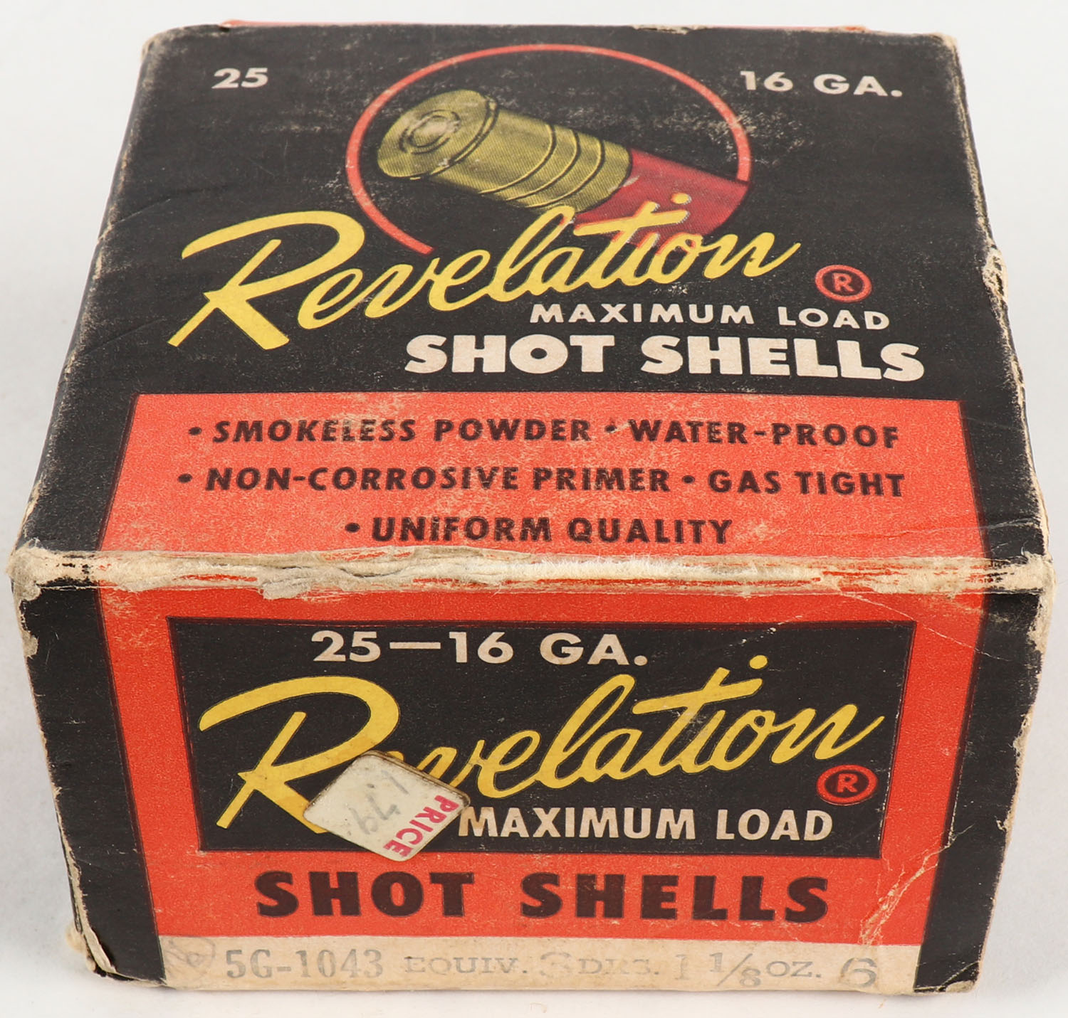 Revelation, Maximum Load, 16ga., 1pc., Partial with 17rds. Being correct, shot size 6, multi-colored box, box has age soiling & scuffing with edge wear, paper shells are good. Grade: Good ++ - Value: 8 to 30