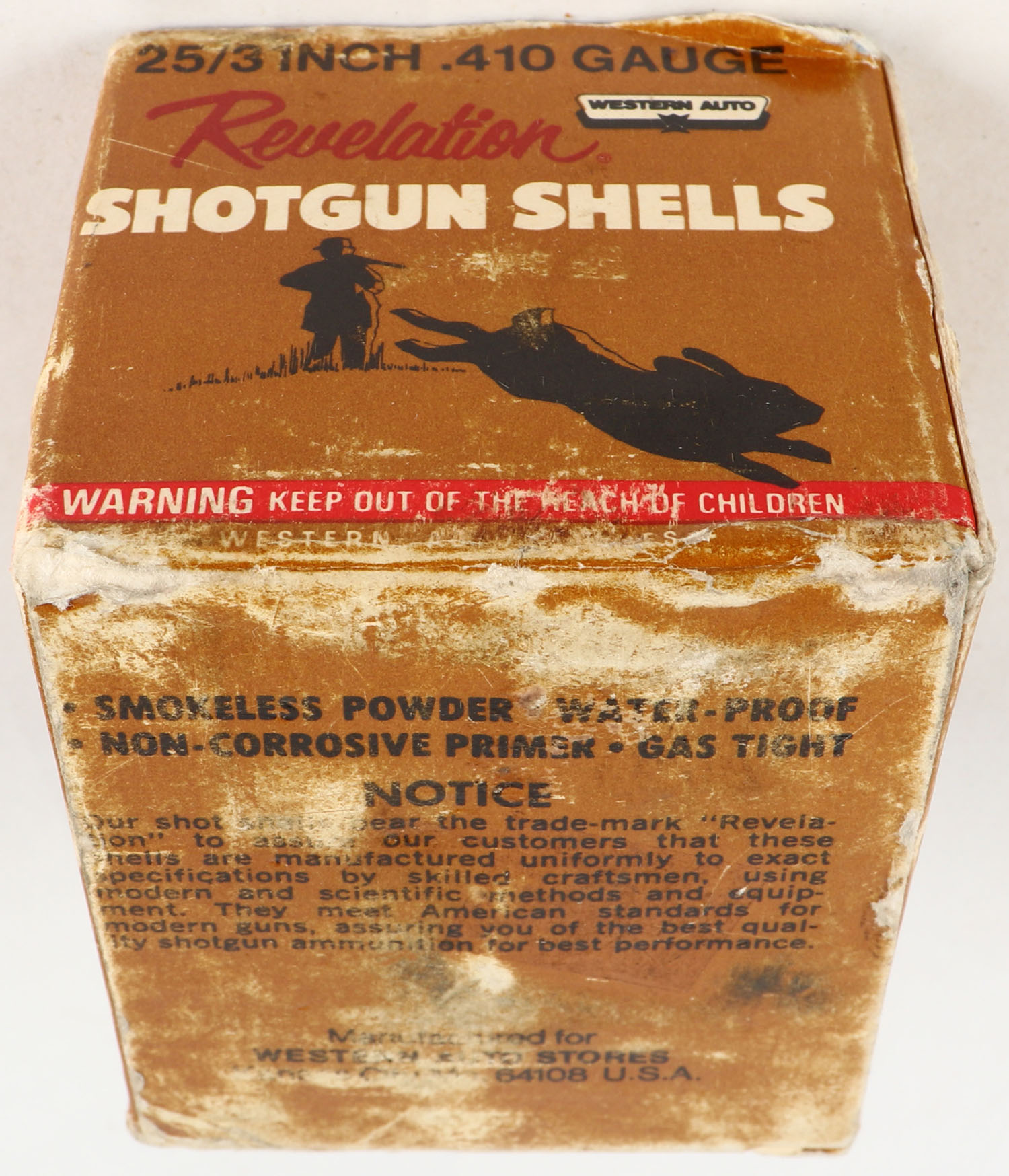Revelation, 410ga., 3'', 1pc., Full, shot size 7 1/2, multi-colored box, box has age soiling with scuffing, plastic shells are excellent. Grade: Good ++ - Value: 10 to 30