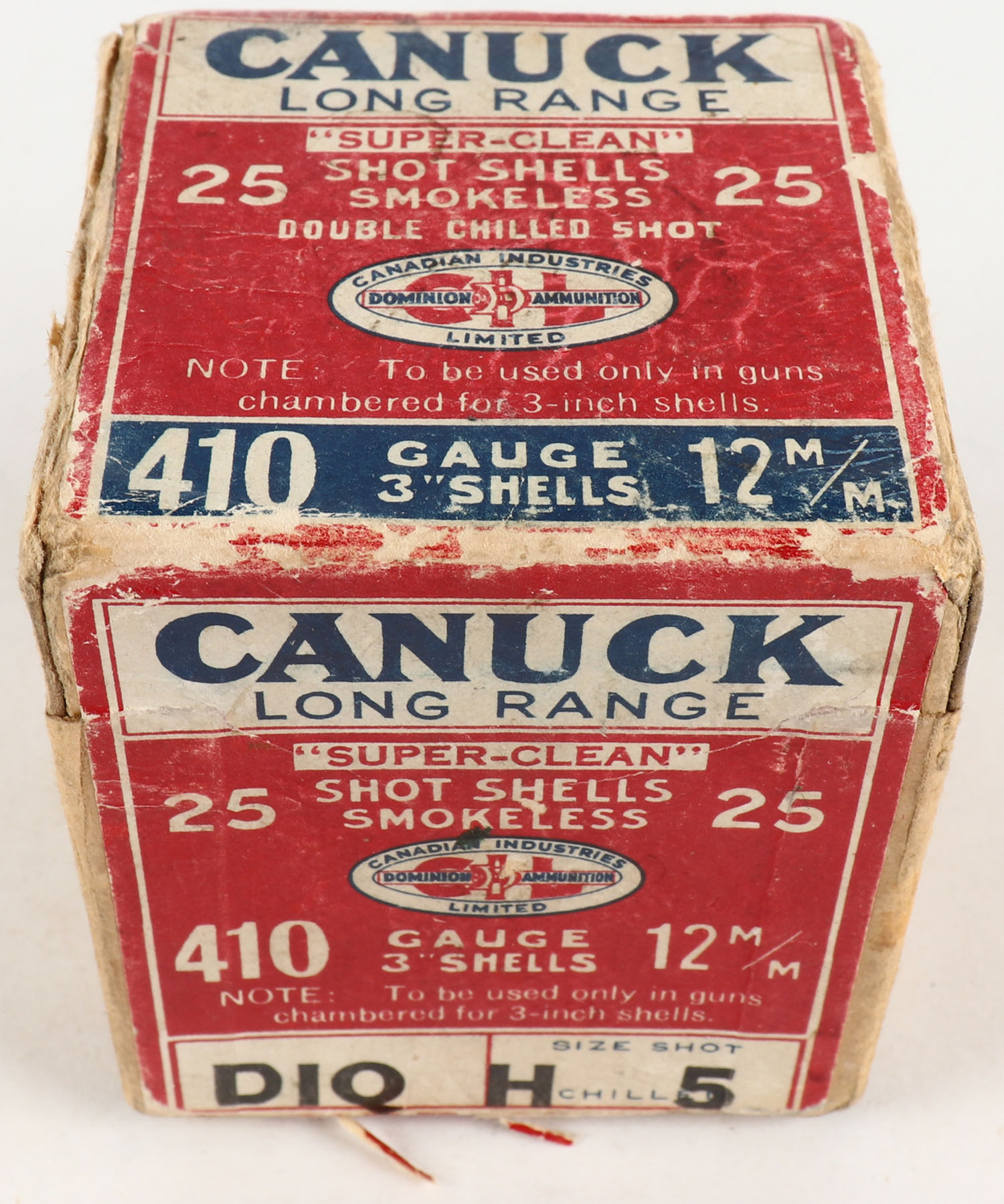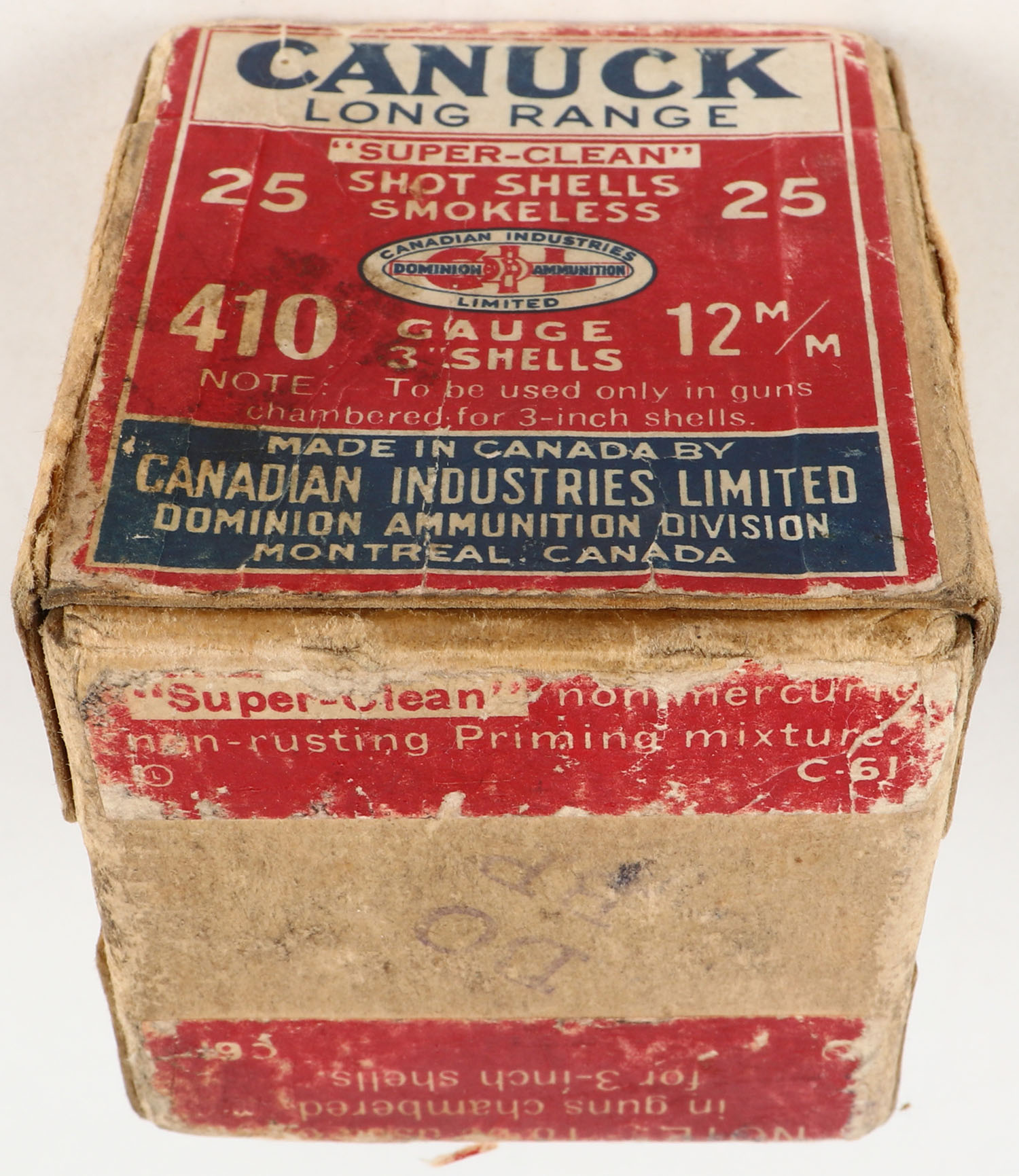 CIL, CANUCK Long Range, 410ga., 2pc., Partial 21rds., shot size 5C, multi-colored box, box has age soiling & scuffing with a seam split, paper shells are excellent. Grade: Very Good - Value: 40 to 200