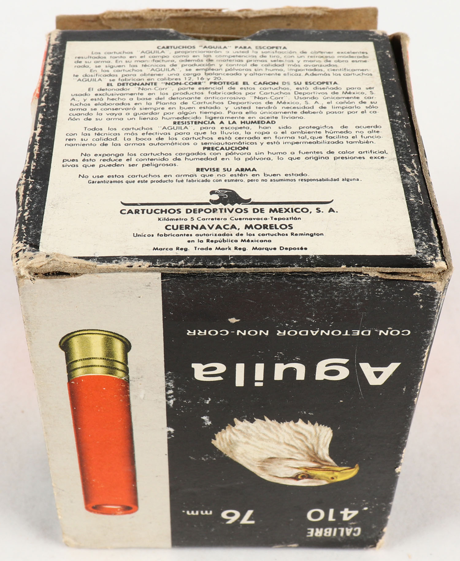 Aguila, 410ga., 3'', 1pc., Full, shot size 6, box is orange, black, and white, box has a seam split & scuffing, paper shells are excellent. Grade: Very Good - Value: 10 to 40