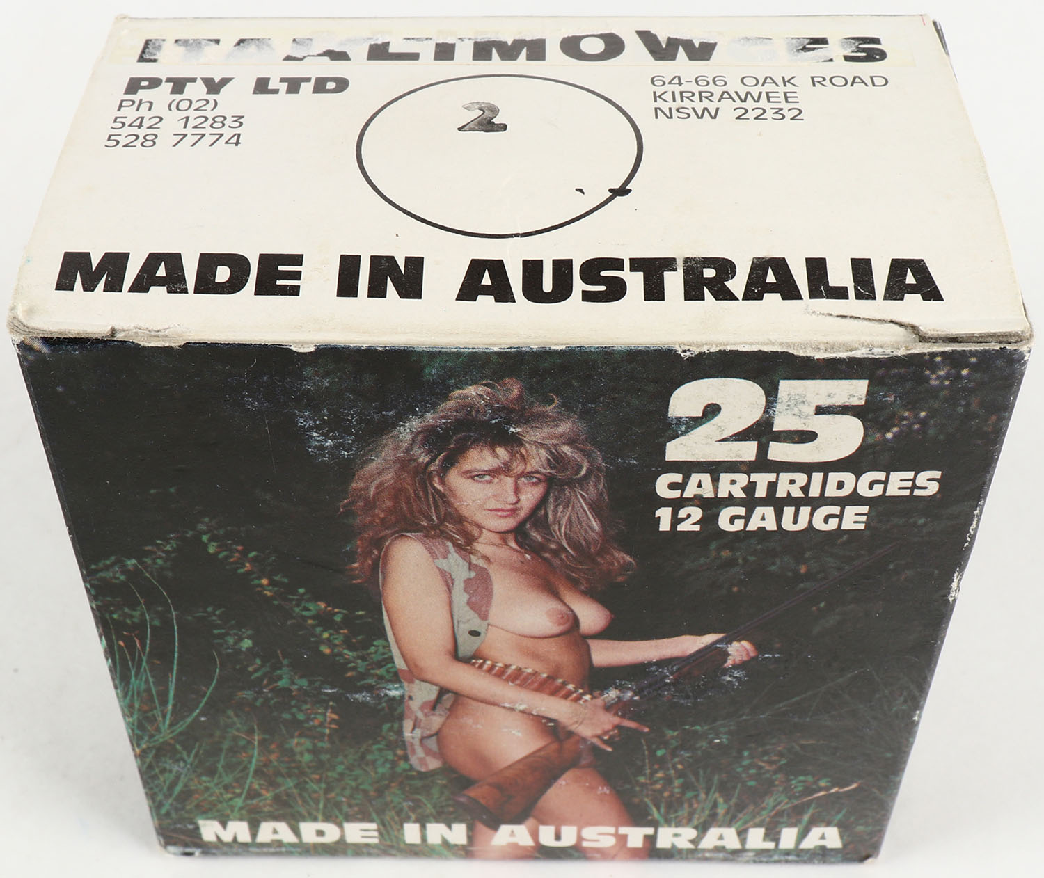 Italcartridges, 12ga., 1pc., Empty. Shot size 2, box is very solid with multi colors. Grade: Excellent - Value: 50 to 200
