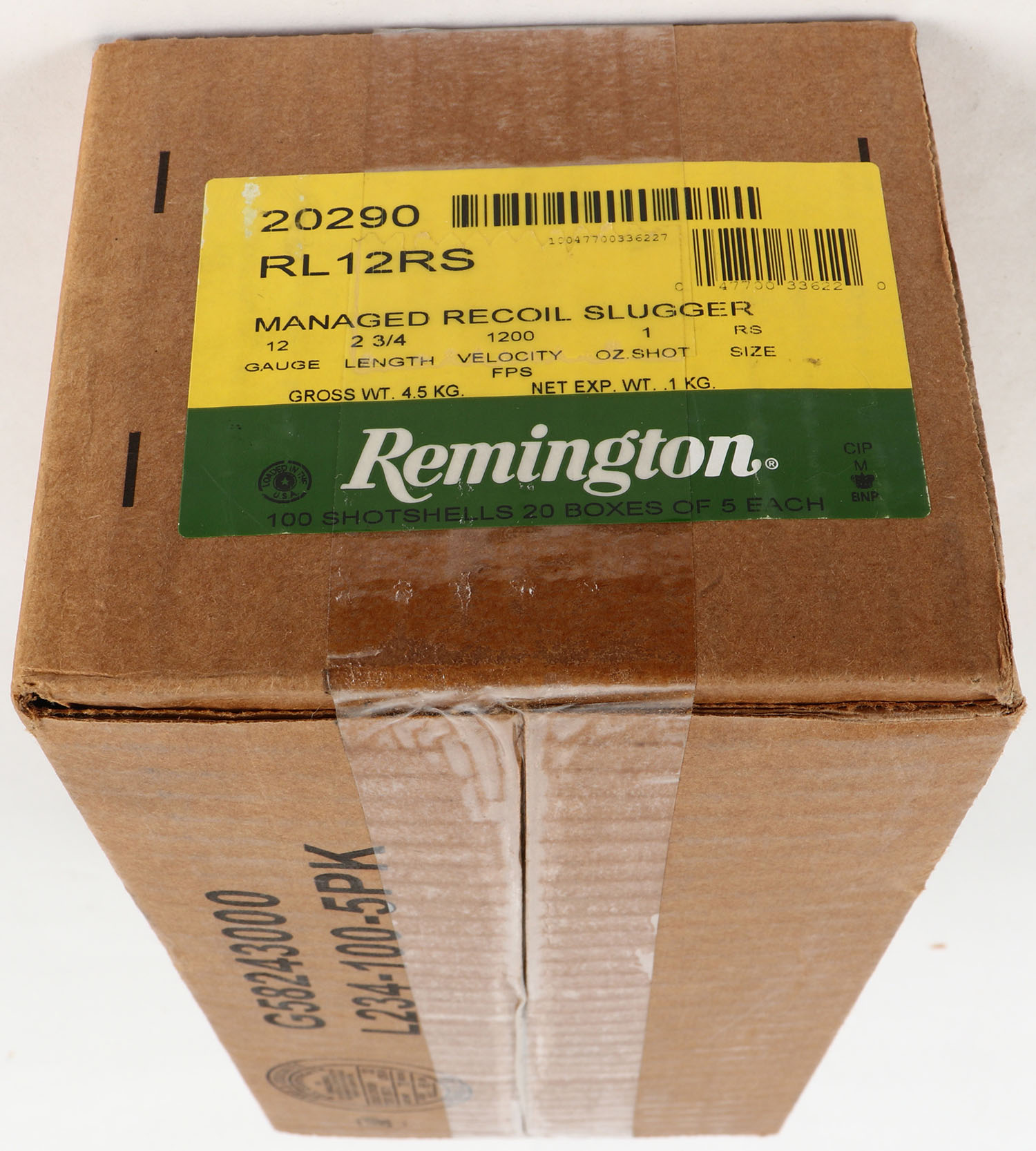 FULL CASE of REMINGTON, Managed Recoil Slugger, 12ga., 2 3/4'', shot size Recoil Slugger, FULL & SEALED, 100rds. Grade: Excellent ++ - Value: 50 to 200