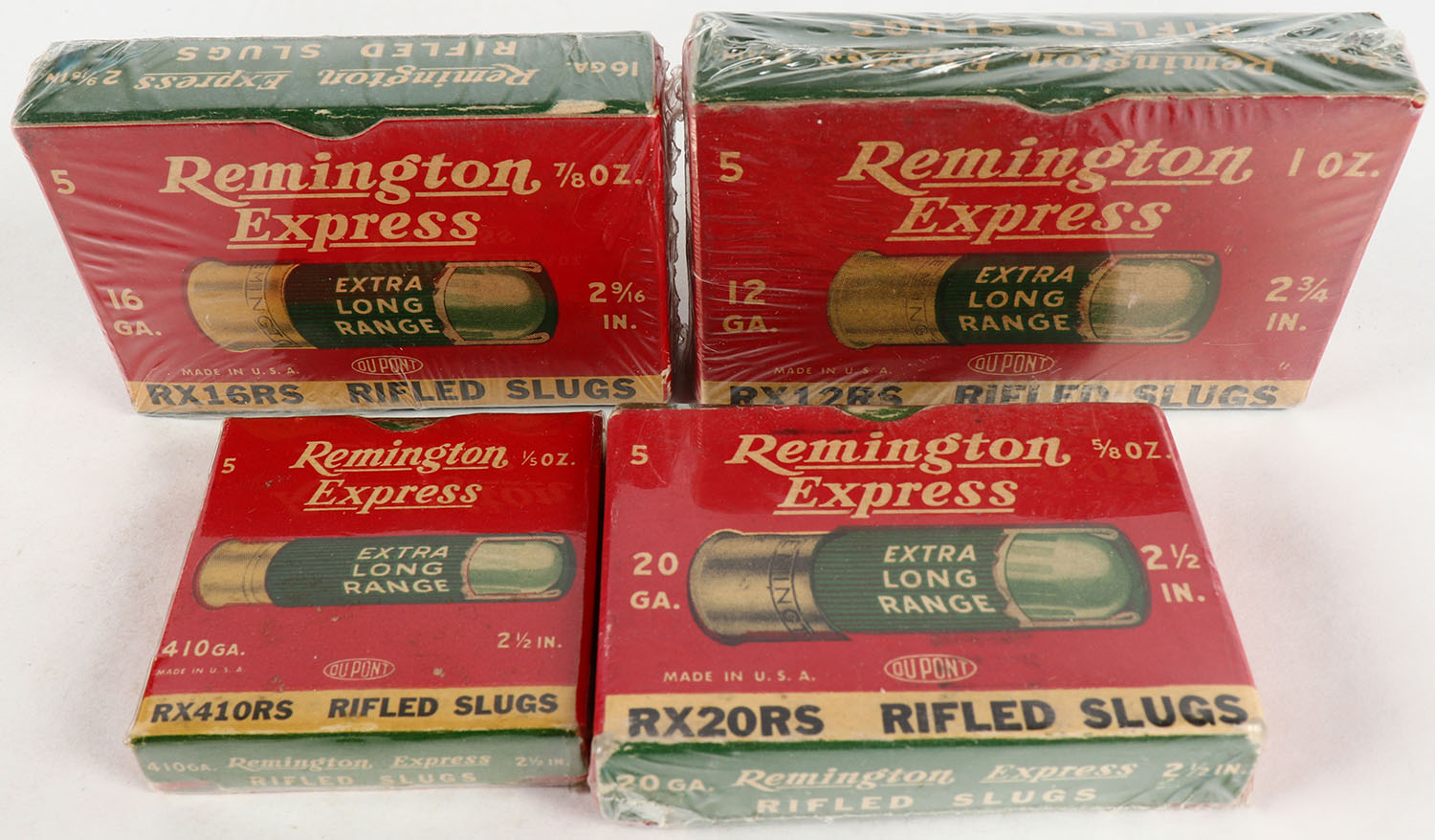 Lot of 4, Remington, 12ga., 16ga., 20ga., 410ga., 1pc., Appears Full, shot size Rifled Slugs, multi-colored boxes. Grade: Excellent - Value: 10 to 80