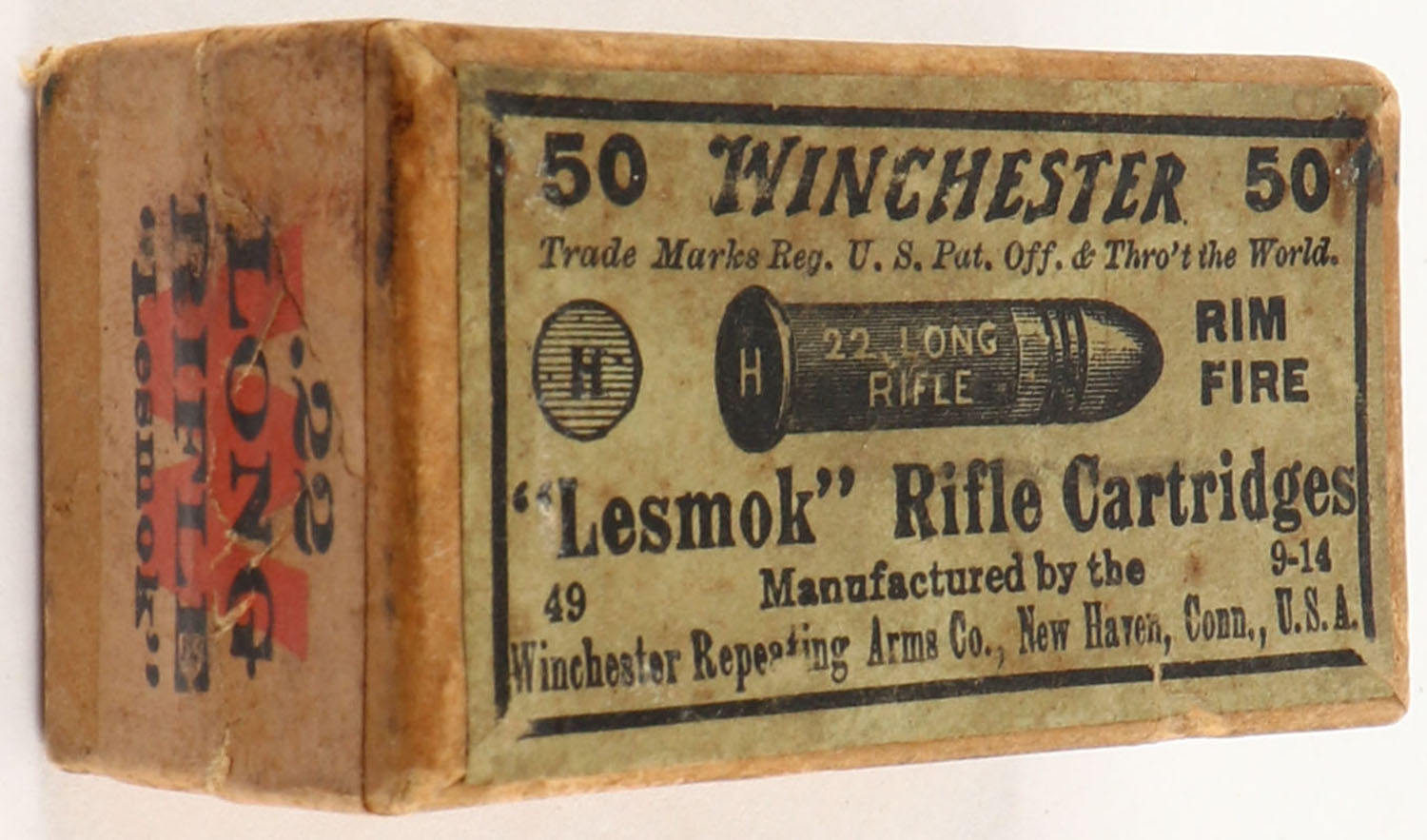 Winchester, ''Lesmok'' Rifle Cartridges, .22 Long Rifle, RR: WRA-121 LR-26c, FULL & SEALED, 2pc. Buff box with green top & off-white side sealing labels, box is solid with good to very good color, some age soiling, minor edge & corner wear, labels are intact. Grade: Very Good ++ - Value: 20 to 80