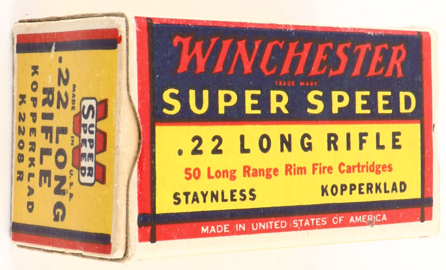 Winchester, Super Speed, .22 Long Rifle, Staynless Kopperklad, RHWeb: WRA-16 LR-1b, Full, 1pc. Yellow blue & red box, box is solid with excellent color, very minor shelf wear, corners are mostly sharp, edges are crisp, end flaps are solid, ammo is excellent. Grade: Excellent + - Value: 10 to 50