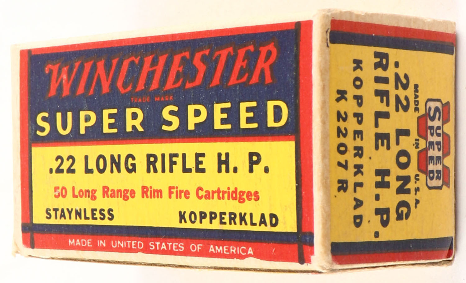Winchester, Super Speed, .22 Long Rifle Hollow Point, Staynless Kopperklad, RHWeb: WRA-16 LR-2b, Full, 1pc. Yellow blue & red box, box is solid with excellent color, very minor corner wear, edges are crisp, end flaps are solid, ammo is excellent. Grade: Excellent + - Value: 10 to 50