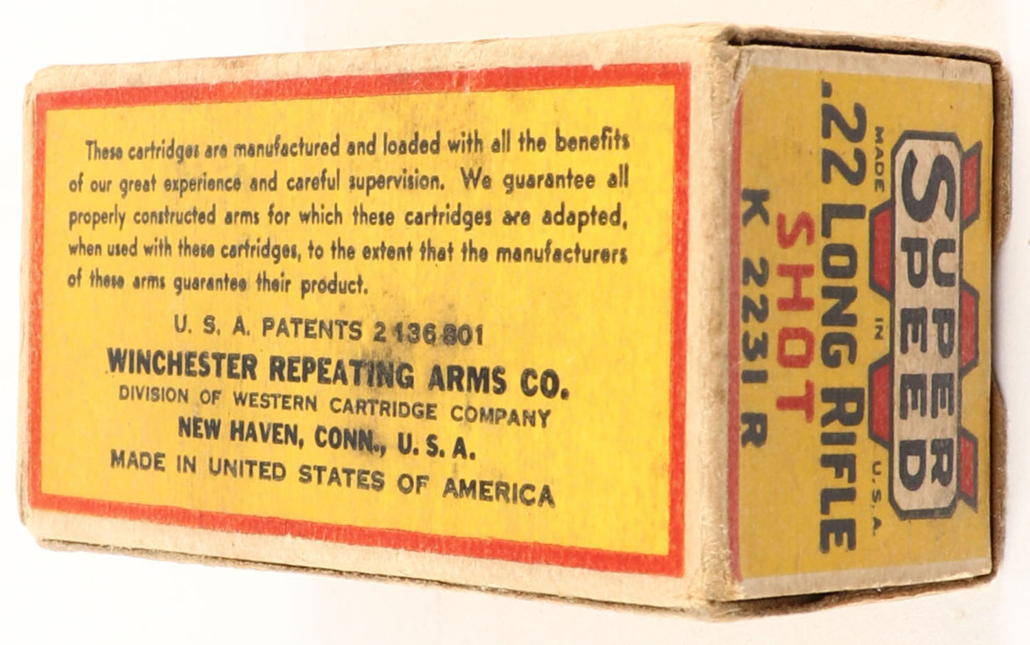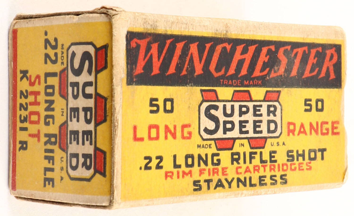Winchester, Super Speed, .22 Long Rifle Shot, RHWeb: WRA-16 LR-2b, Full, 1pc. Yellow black & red box, box is solid with very good to excellent color, very minor age soiling & color fading, very minor corner wear, edges are mostly crisp, end flaps are solid, ammo is excellent. Grade: Excellent - Value: 50 to 150
