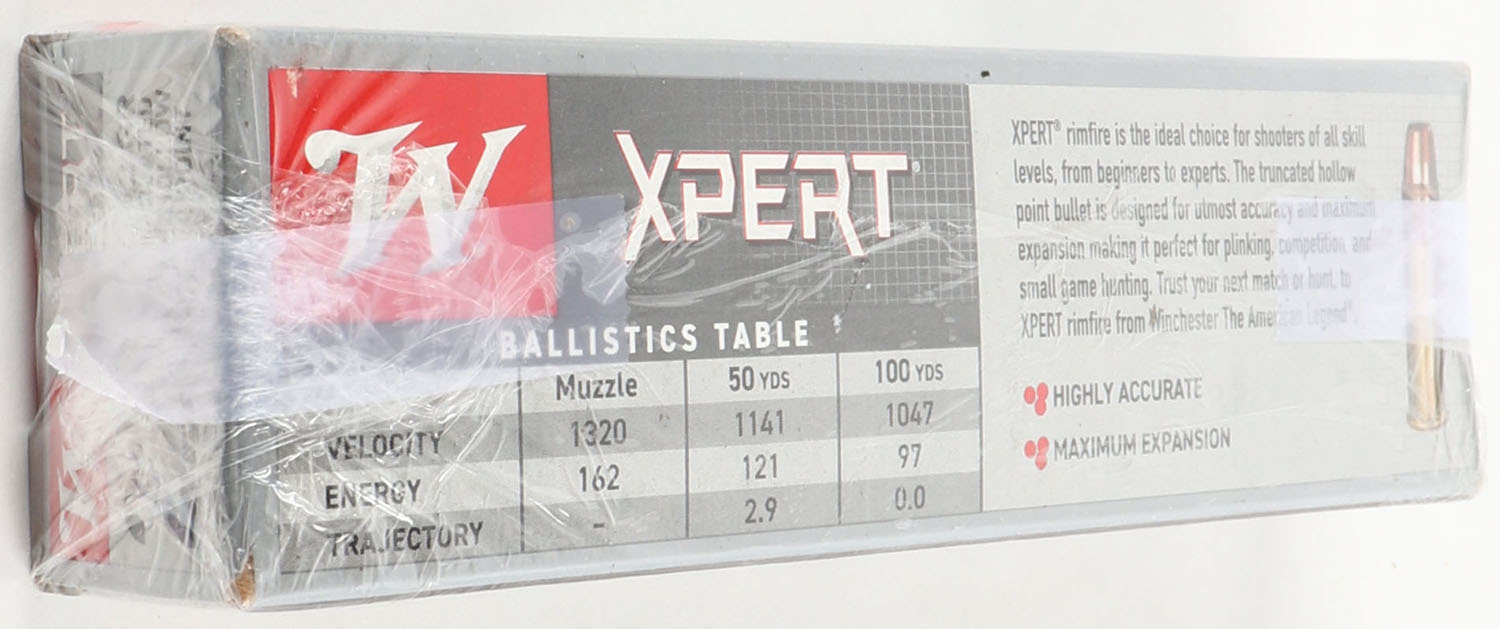 Winchester, Xpert, .22 Long Rifle, 42 Grain Copper Plated Hollow Point, 1320 FPS, Full, 100rds., 1pc. Gray red & white box, box is MINT with minty color, corners are sharp, edges are crisp, end flaps are solid, ammo is mint. Grade: MINT - Value: 12 to 36
