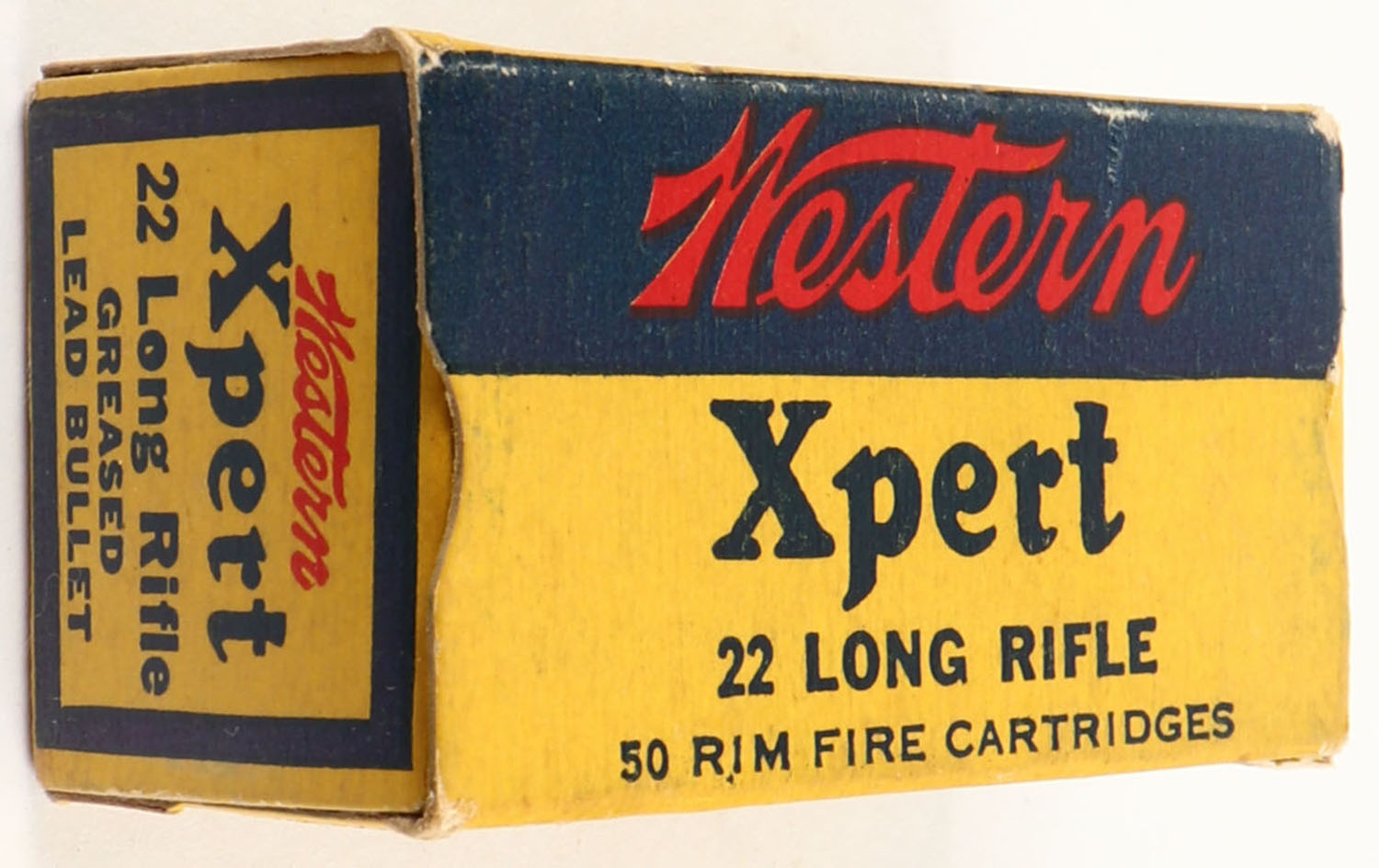 Western, Xpert, .22 Long Rifle, Greased Lead Bullet, RHWeb: WCC-52 LR-1n, Full, 1pc. Yellow blue & red box, box is solid with very good to excellent color, minor age soiling & shelf wear, some corner wear, edges are crisp, end flaps are solid, ammo is excellent. Grade: Excellent - Value: 16 to 60