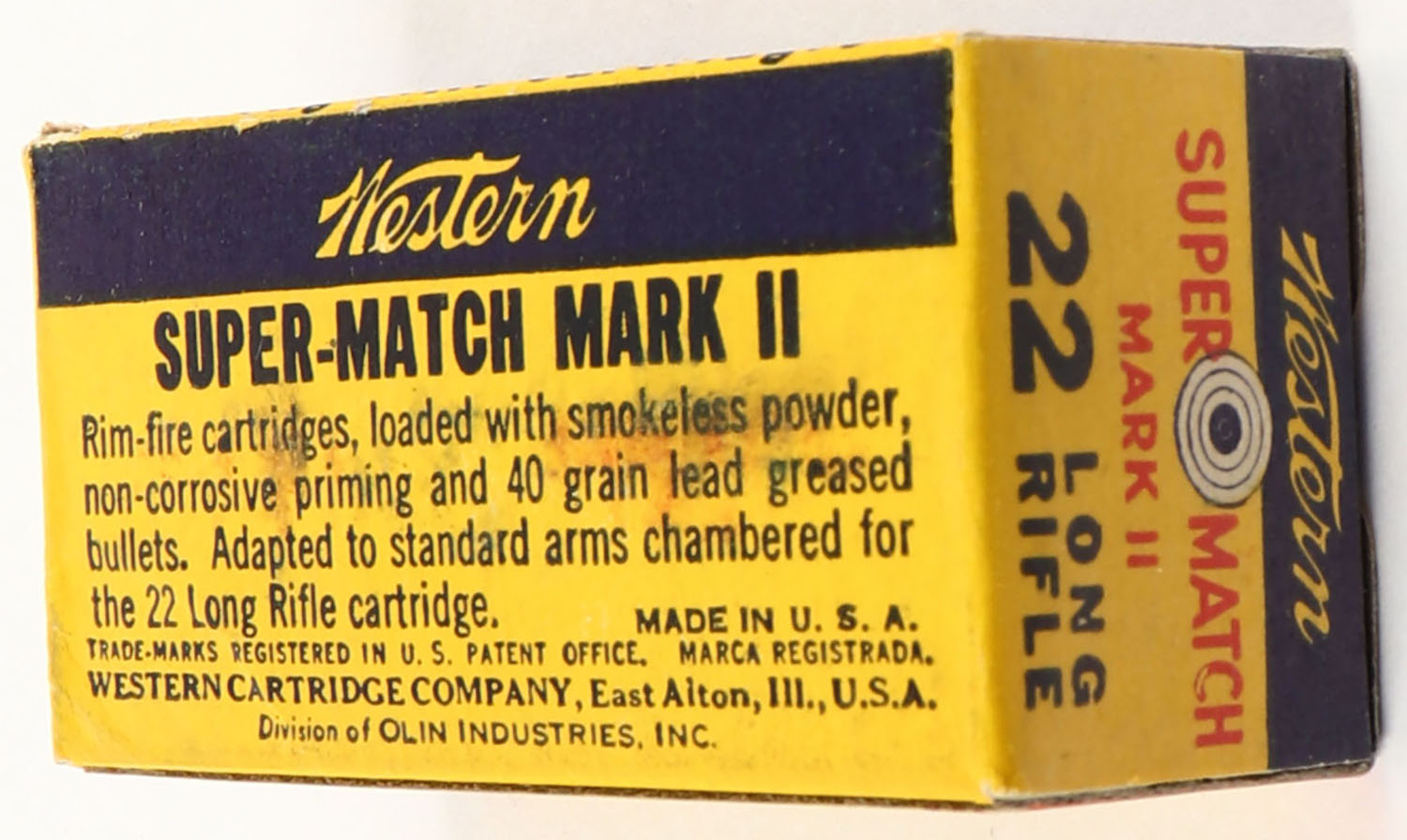 Western, Super Match Mark II, .22 Long Rifle, RHWeb: WCC-51.2 LR-3g, Full, 1pc. Yellow blue & red box, box is near mint with minty color, only very minor color bleeding, corners are sharp, edges are crisp, end flaps are solid, ammo is excellent. Grade: Excellent + - Value: 8 to 40