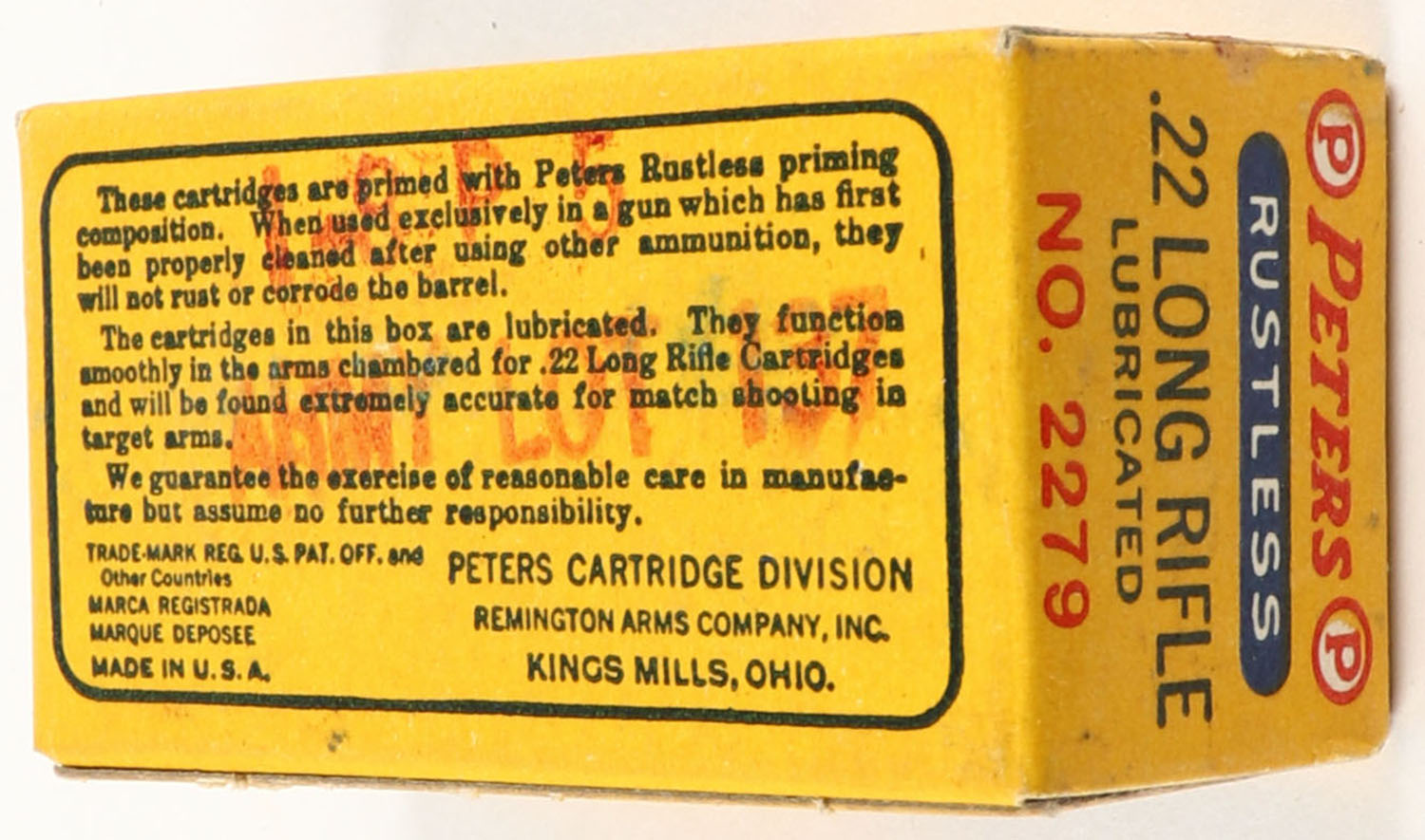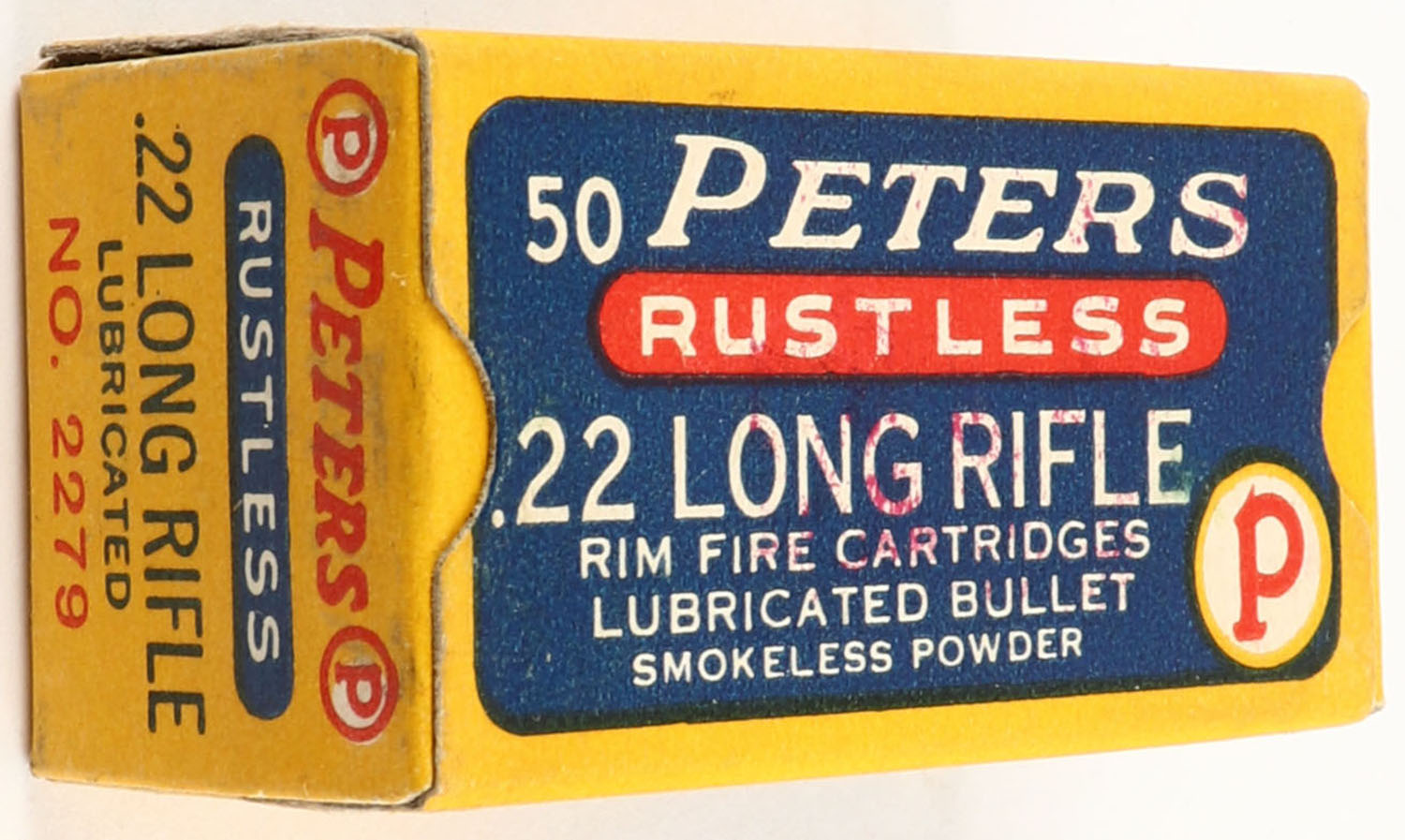Peters, Rustless, .22 Long Rifle, Lubricated Bullet, Smokeless Powder, Army Lot 137, RHWeb: PCC-8C LR-2b, Full, 1pc. Blue yellow & red box, box is solid with excellent color, minor staining on top & front, corners are mostly sharp, edges are crisp, end flaps are solid, ammo is very good. Grade: Excellent - Value: 16 to 60