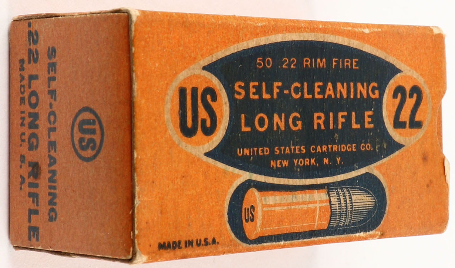 U.S., Self-Cleaning, .22 Long Rifle, RHWeb: US-10A LR-1c, Full, 1pc. Orange & blue box, box is solid with good to very good color, some age soiling & color fading, minor corner wear, very minor edge wear, end flaps are solid, ammo is very good. Grade: Very Good + - Value: 16 to 60