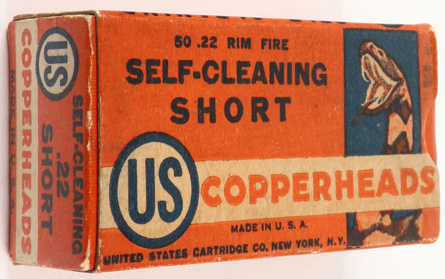 U.S., Copperheads, .22 Short, Self-Cleaning, RHWeb: US-12 S-1a, Partial 49rds., 1pc. Orange white & blue box, box is solid with very good color, minor age soiling, very minor edge & corner wear, end flaps are solid, ammo is very good. Grade: Very Good ++ - Value: 30 to 90