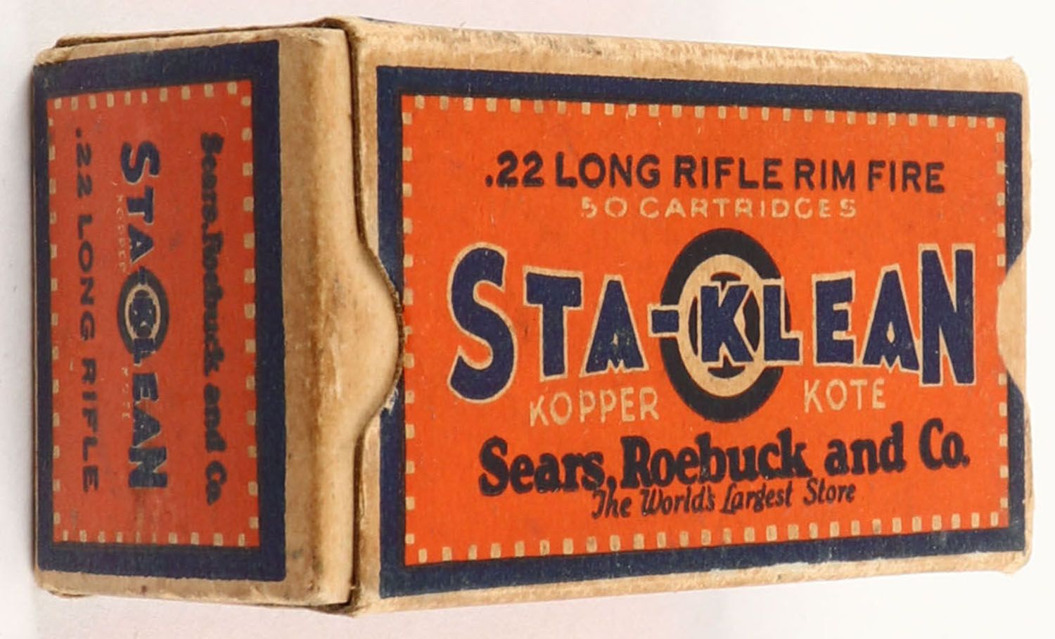 Sears, Sta-Klean, .22 Long Rifle, Kopper Kote, RHWeb: SEARS-3 LR-1a, Full, 1pc. Orange blue & buff box, box is solid with excellent color, minor age soiling, very minor corner wear, edges are mostly crisp, end flaps are solid, ammo is excellent. Grade: Excellent - Value: 100 to 400