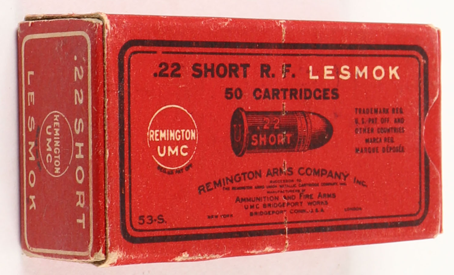 REM-UMC, R.F. Lesmok Cartridges, .22 Short, RHWeb: REM-5 S-2, Full, 1pc. Red black & white box, box is solid with excellent color, very minor age soiling, very minor edge & corner wear, end flaps are solid, ammo is fair. Grade: Excellent - Value: 10 to 50