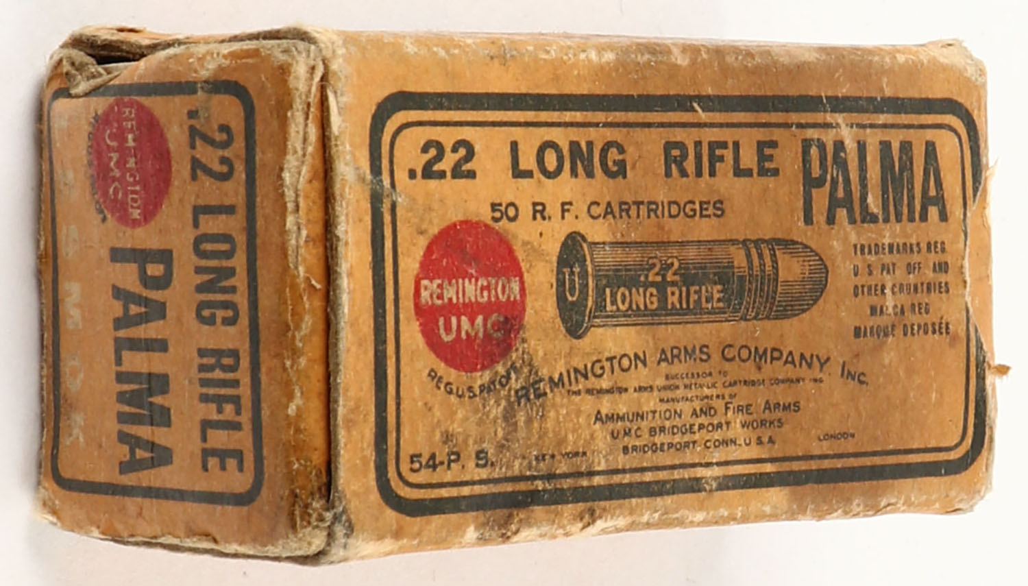 REM-UMC, Palma, .22 Long Rifle, Lesmok, RHWeb: REM-52 LR-1b, Partial 48rds., 1pc. Orange black & red box, box is solid with fair color, age soiling, color fading, stain on top, edge & corner wear, right end flap has been torn & repaired, ammo is good. Grade: Good - Value: 6 to 30