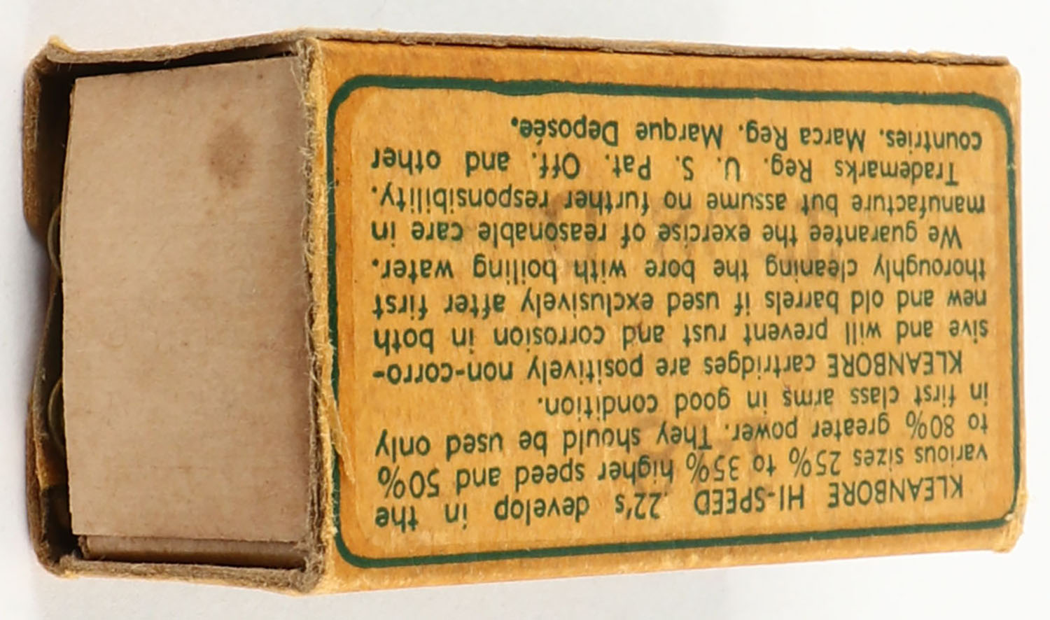 Remington, Palma Hi-Speed Kleanbore, .22 Long Rifle, RHWeb: REM-52 LR-12b, Full, 1pc. Green buff & red dog bone box, missing right end flap is torn, insert tab of right end flap is torn, very good color, some age soiling, minor edge & corner wear, left end flap is solid, ammo is excellent. Grade: Good ++ - Value: 4 to 20