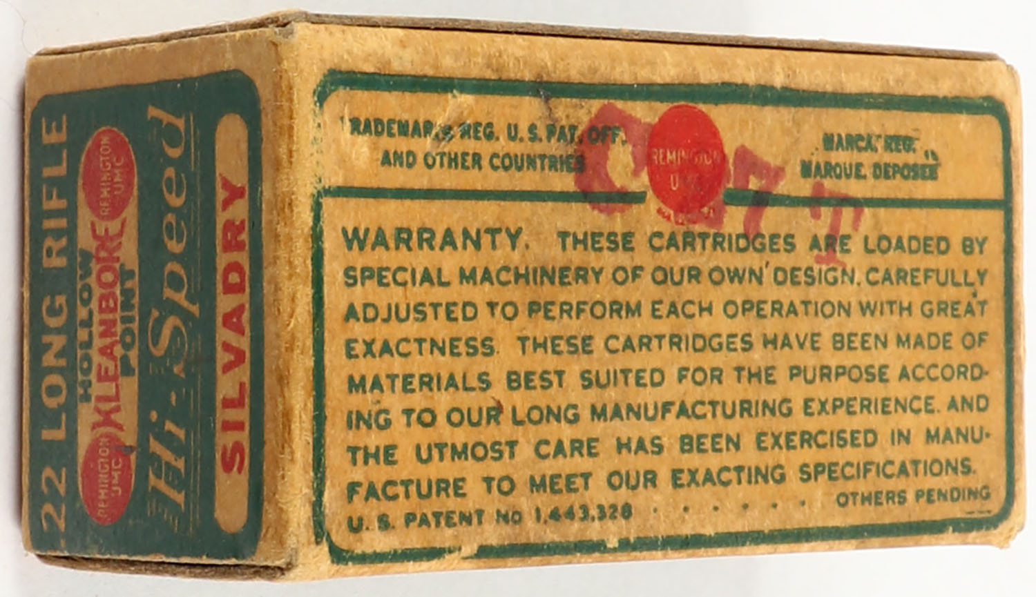 Remington, Silvadry Hi-Speed Silvadry, .22 Long Rifle Hollow Point, RHWeb: REM-7.5 LR-1d, Full, 1pc. Green buff & red dog bone box, box is solid with very good color, age soiling, minor corner wear, edges are mostly crisp, end flaps are solid, ammo is excellent. Grade: Very Good ++ - Value: 30 to 90