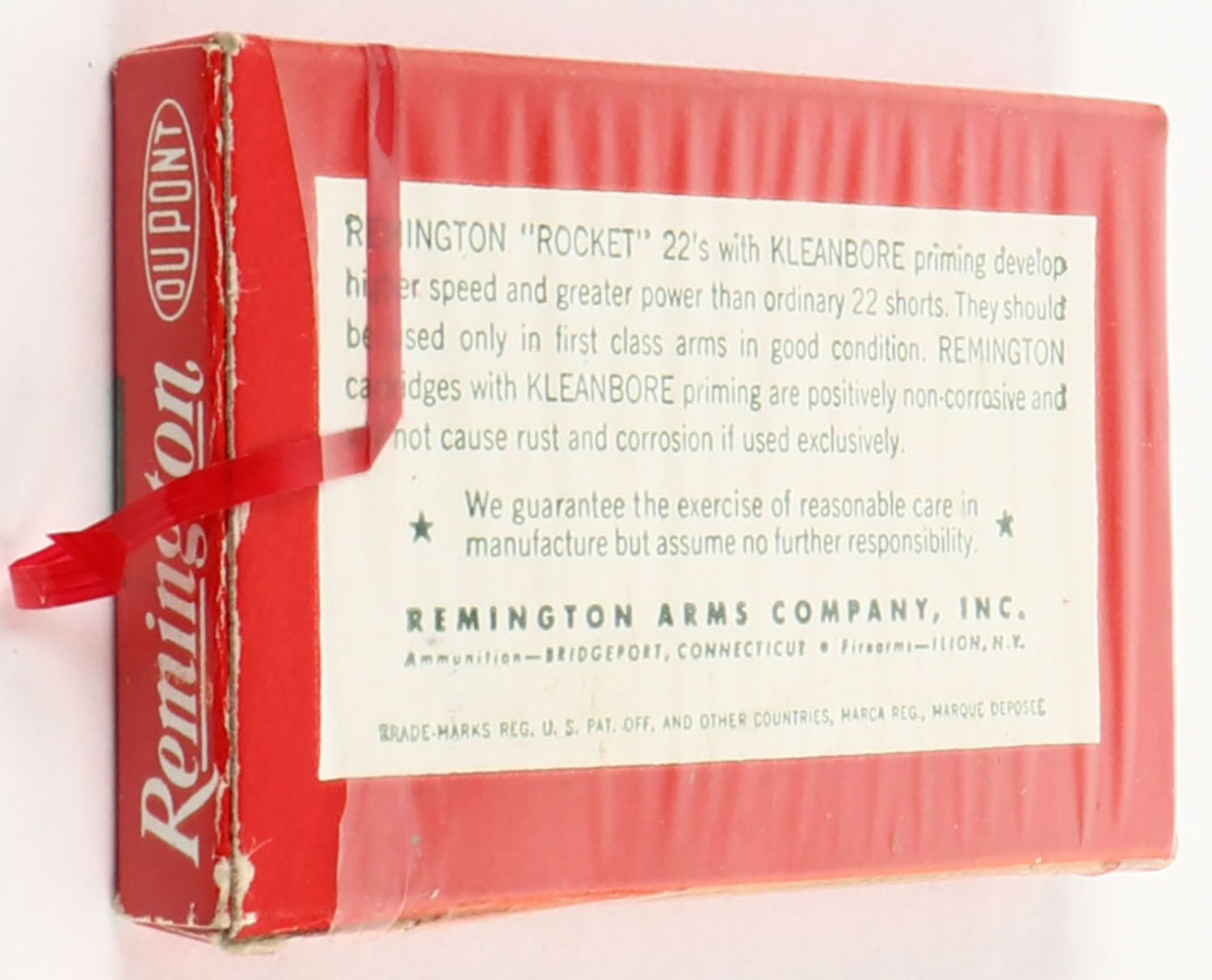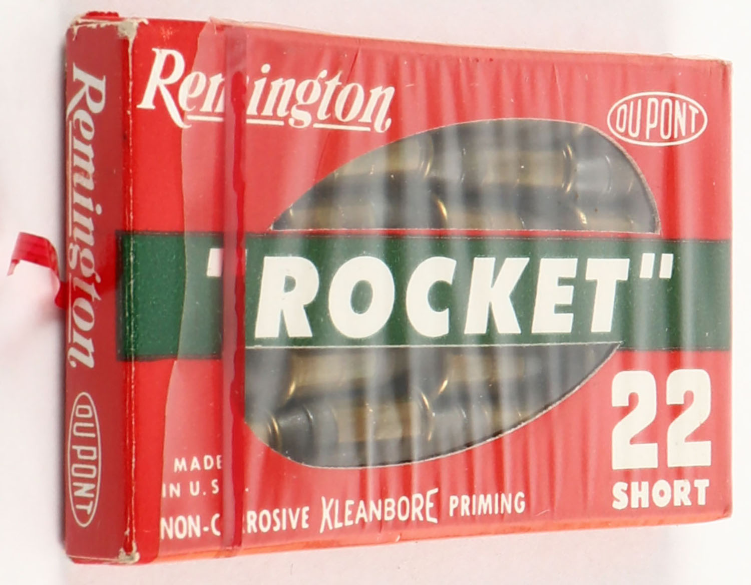 Remington, ''Rocket'', .22 Short, RHWeb: REM-14 S-5, Full & partially sealed (left end of plastic wrap is open), 1pc. Red green & white box, box is MINT with minty color, corners are sharp, edges are crisp, ammo appears minty. Grade: MINT - Value: 30 to 90