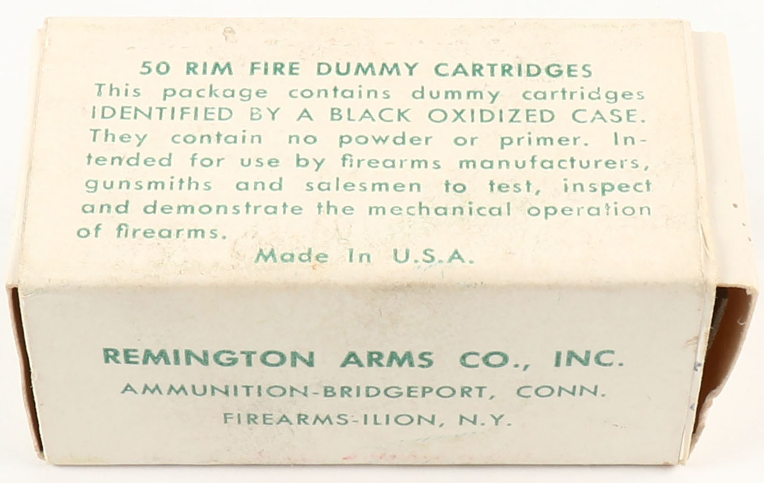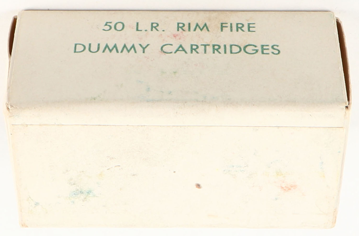 Remington, Rim Fire Dummy Cartridges, .22 Long Rifle, RHWeb: REM-19 S-8, Full, 1pc. White box with green printing, box is solid with very good to excellent color, some age soiling, corners are sharp, edges are crisp, end flaps are solid, ammo is minty. Grade: Excellent + - Value: 10 to 50