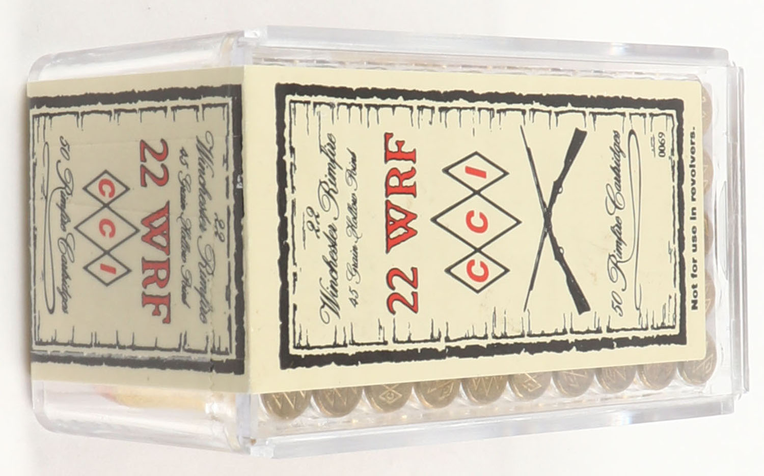 CCi, Rimfire Cartridges, .22 Winchester Rimfire, 45 Grain Hollow Point, FULL & SEALED, 2pc. Clear plastic tray with tan sealing label, box and label are mint, ammo appears minty. Grade: MINT - Value: 10 to 50