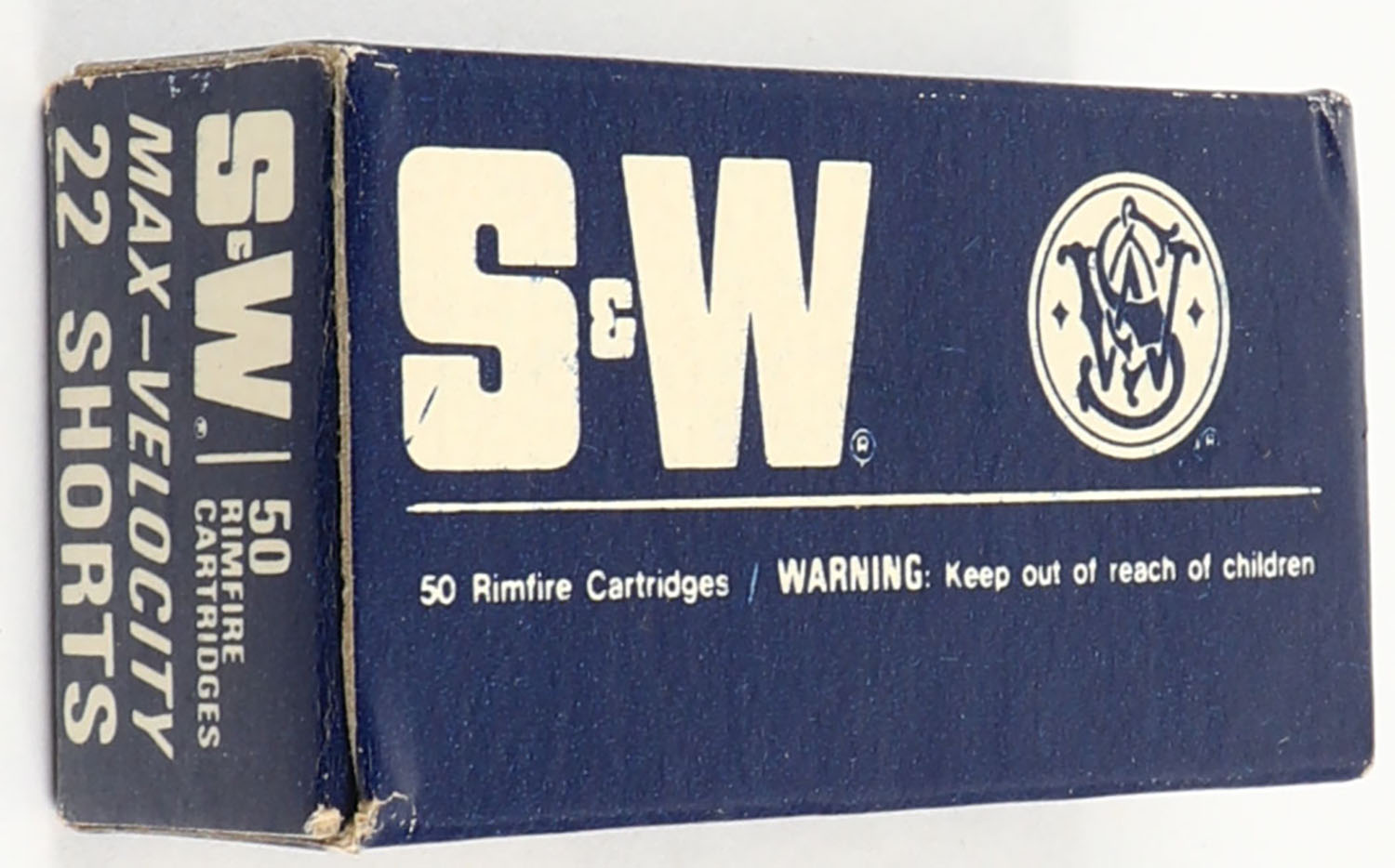 Smith & Wesson, .22 Short, Max-Velocity, RHWeb: S&W-2 S-3, Full, 1pc. Blue & white box, box is near mint with minty color, only very minor corner wear, edges are crisp, end flaps are solid, ammo is minty. Grade: Excellent ++ - Value: 10 to 50
