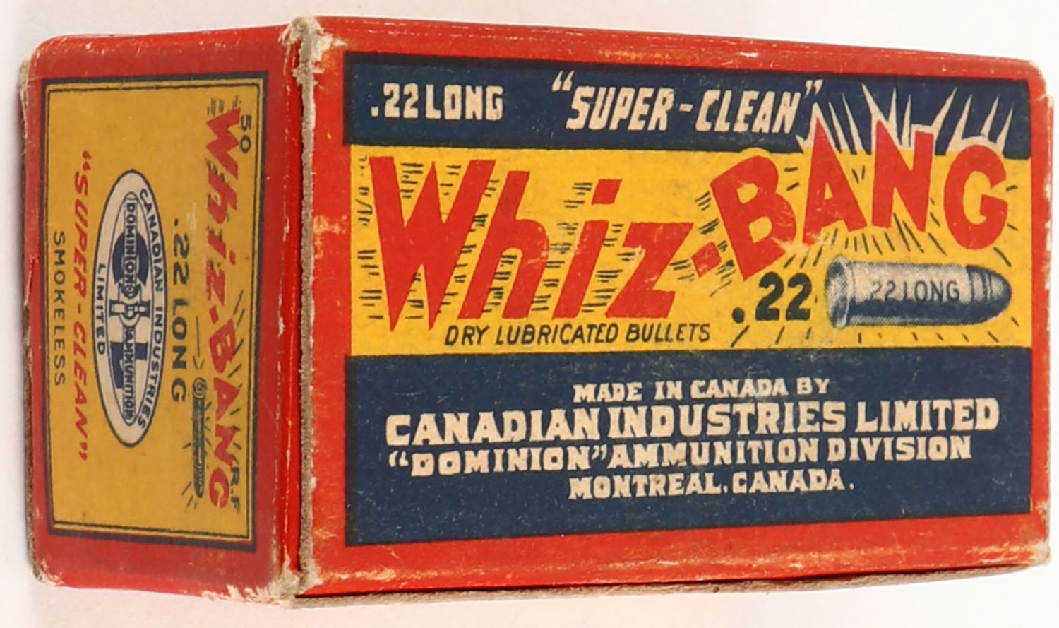 C.I.L., Whiz-Bang, .22 Long, Dry Lubricated Bullets, RHWeb: (Canada) CIL-2 L-3b, Full, 1pc. Red yellow & blue box, box is solid with excellent color, staining & color fading on front, minor corner wear, edges are crisp, top flap is solid, ammo is excellent. Grade: Excellent - Value: 20 to 60