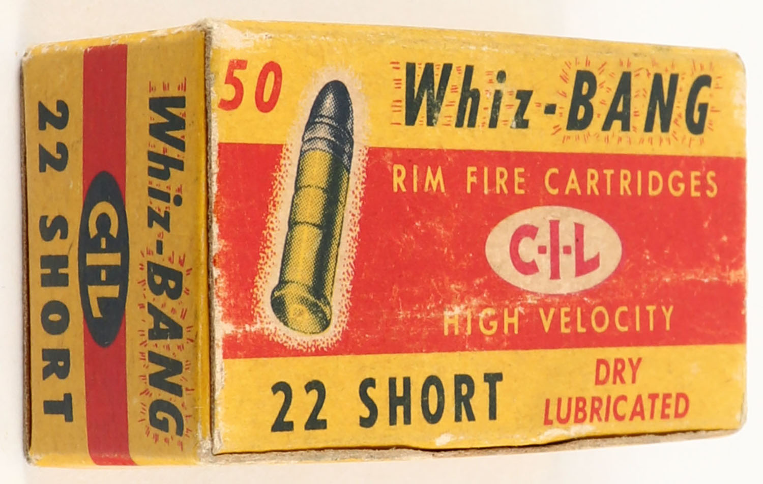 C.I.L., Whiz-Bang High Velocity, .22 Short, Dry Lubricated, RHWeb: (Canada) CIL-4 S-3, Full, 1pc. Yellow & red box, box is solid with very good color, some color fading, minor age soiling, some edge & corner wear, top flap is solid, ammo is excellent. Grade: Very Good ++ - Value: 8 to 40