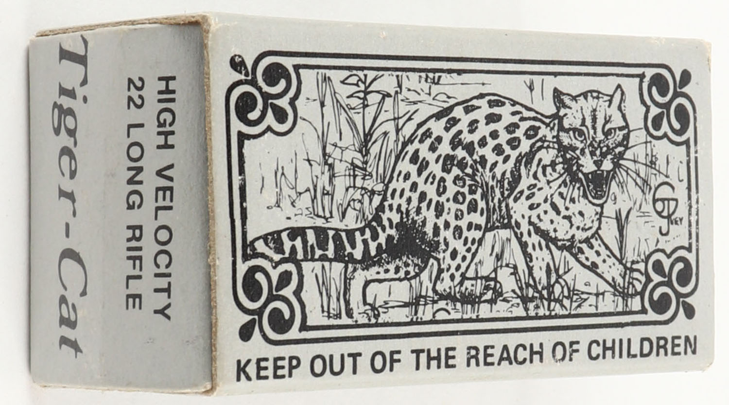 Sovereign, Tiger-Cat, .22 Long Rifle, High Velocity, RHWeb: SGD-1 LR-1a, Full, 1pc. Silver & black box, box is near mint with minty color, only very minor corner wear, edges are crisp, end flaps are solid, ammo is excellent to minty. Grade: Excellent ++ - Value: 16 to 60
