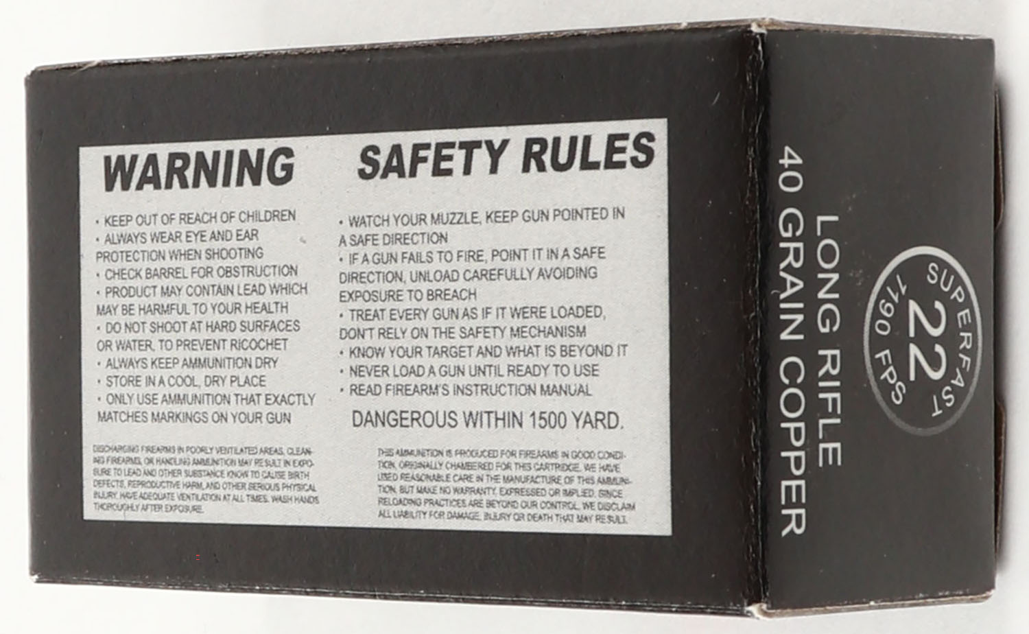 American Precision, Superfast, .22 Long Rifle, 40 Grain Copper, RHWeb: (Mexico) MEX-CCI-7 LR-2, Full, 1pc. Black box with white red & blue printing, box is MINT with minty color, corners are sharp, edges are crisp, end flaps are solid, ammo is minty. Grade: MINT - Value: 10 to 50