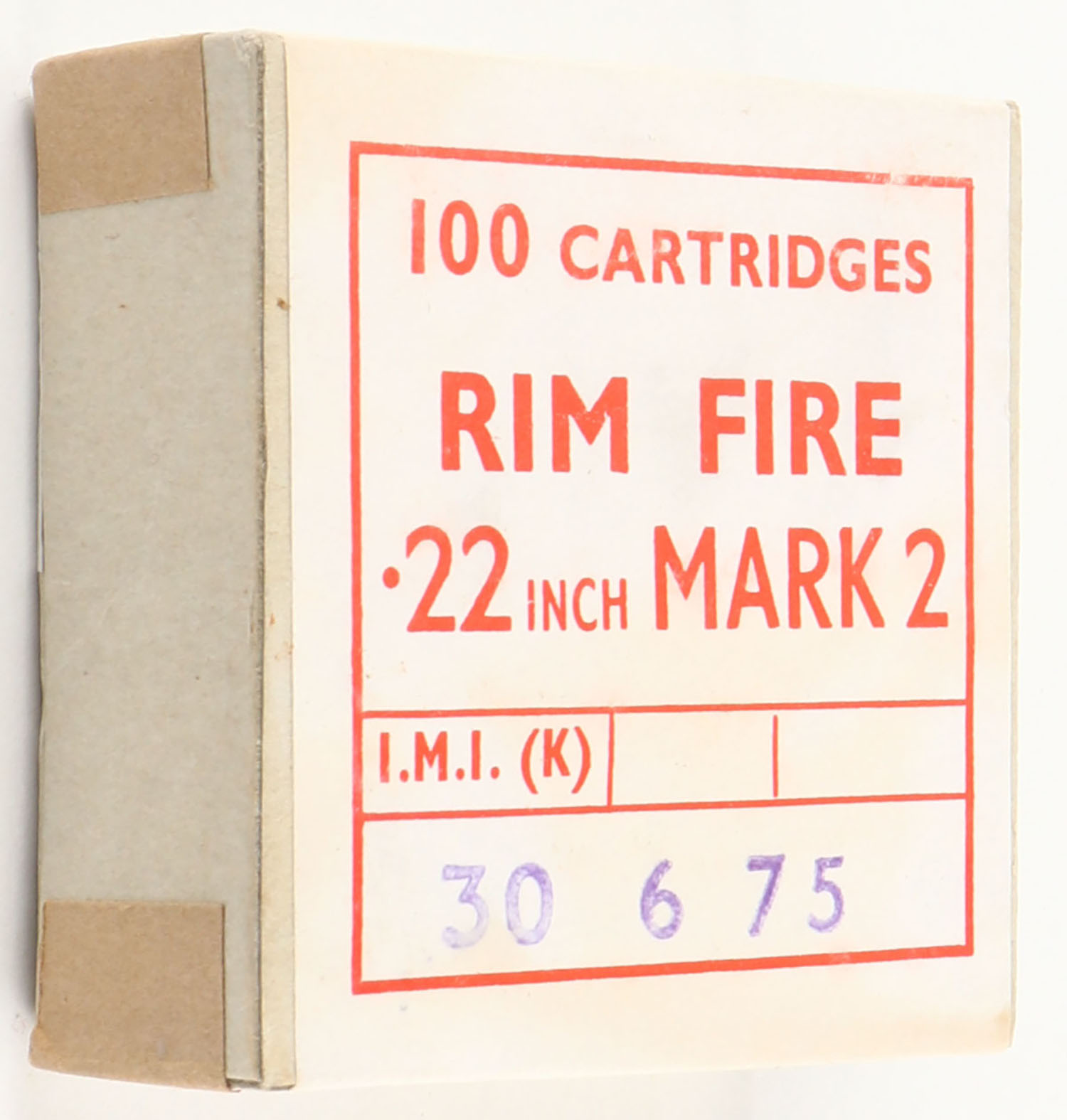 I.M.I., Mark 2, .22 Long Rifle, RHWeb: (England) IMI-5 LR-1, FULL & SEALED, 2pc. Buff box with white & red wraparound label, box is near mint with excellent to minty color, only very minor age soiling, corners are sharp, edges are crisp, label is intact. Grade: Excellent ++ - Value: 10 to 50