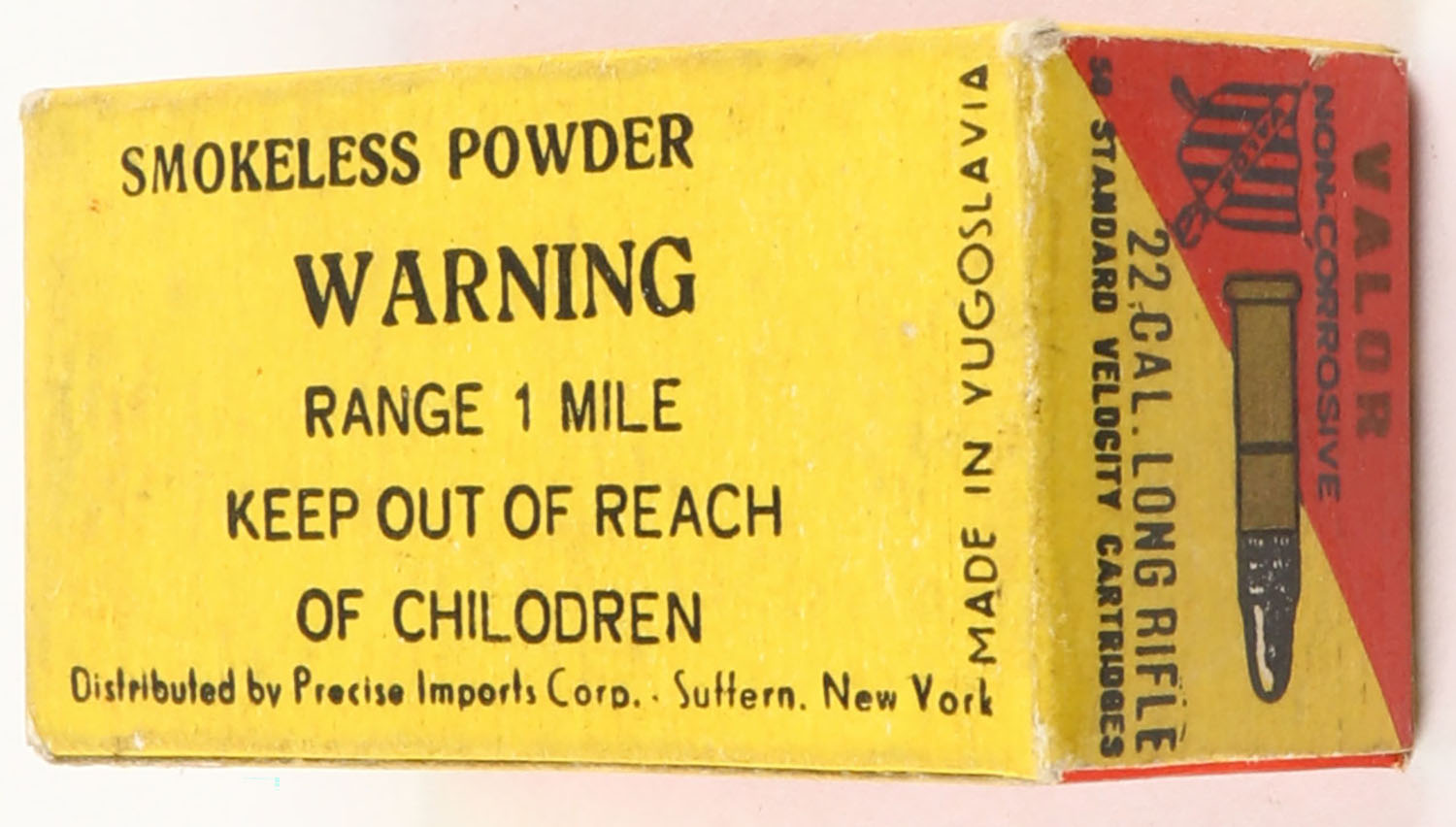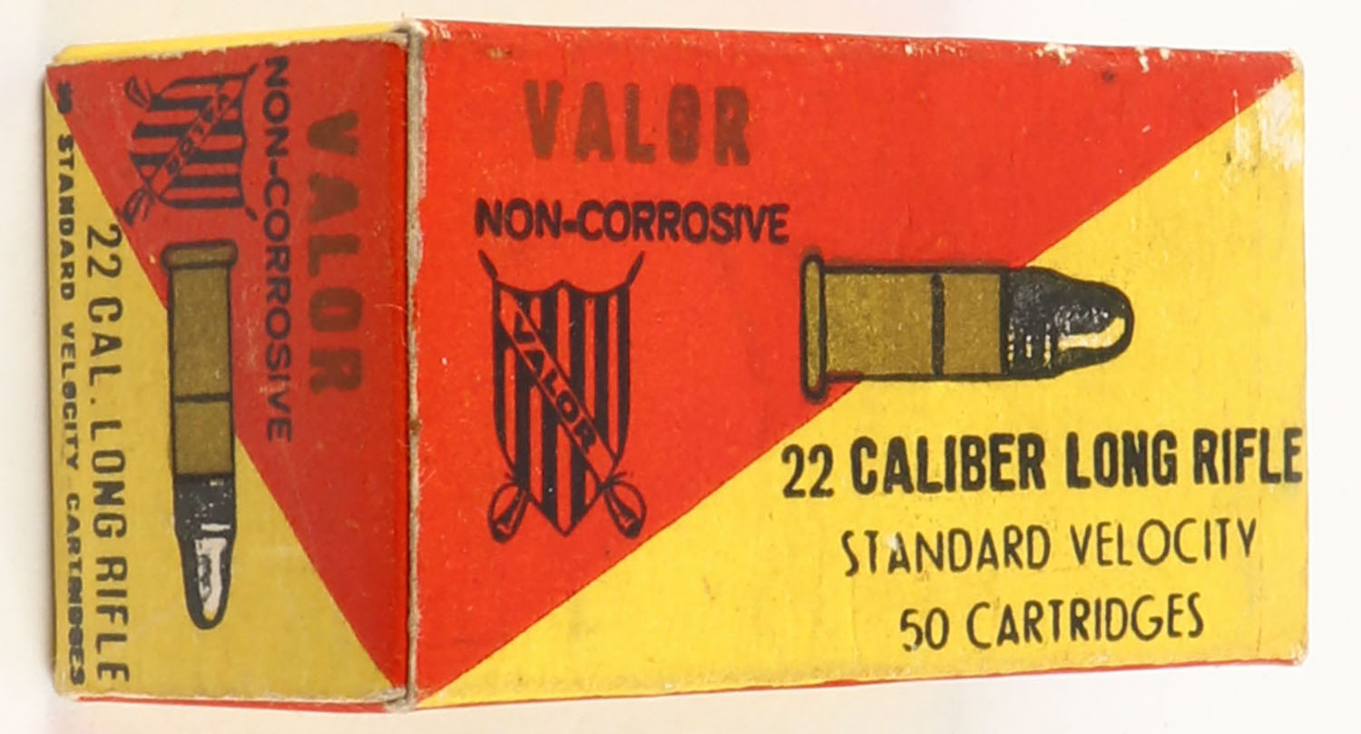 Valor, Non-Corrosive, .22 Long Rifle, Standard Velocity, RHWeb: (Yugoslavia) VAL-1 LR-1, Full, 1Pc red & yellow box, box is solid with very good to excellent color, very minor age soiling, & shelf wear, corners are mostly sharp, edges are crisp, end flaps are solid, ammo is very good to excellent. Grade: Excellent - Value: 4 to 20
