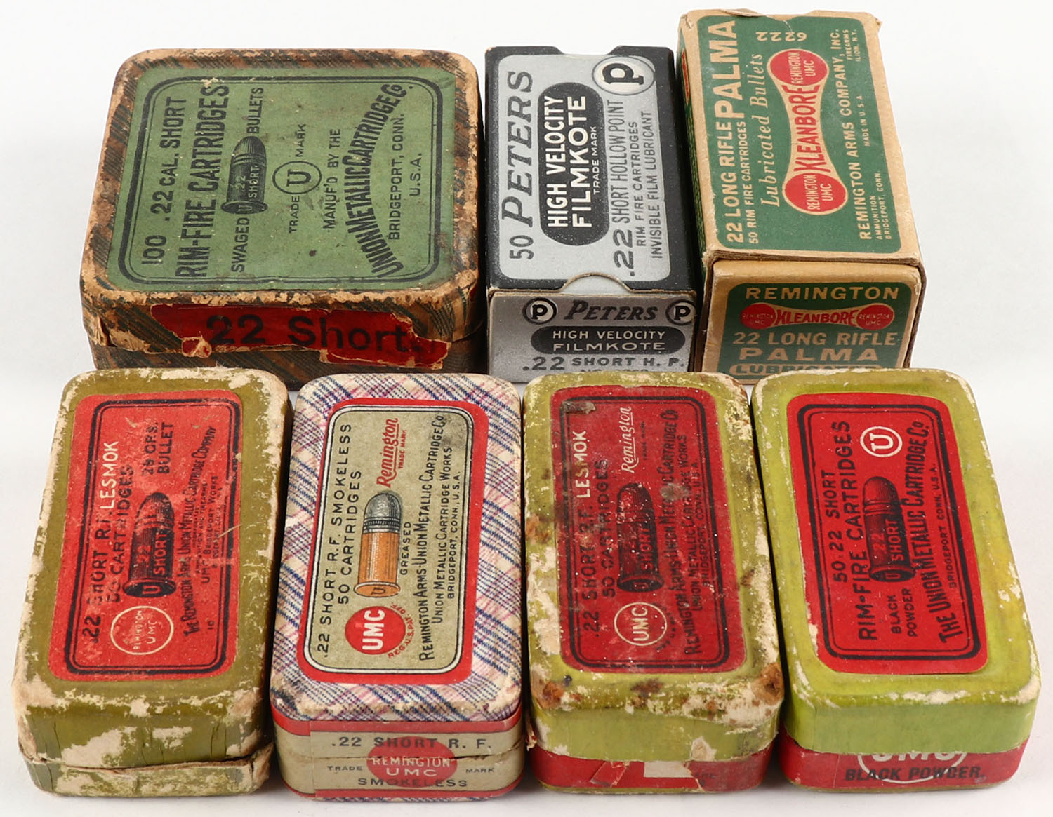 Mixed Mfg., lot of (7) boxes, Palma box is partial 25rds, UMC box is partial 30rds., REM-UMC fabric box is partial 8rds., all other boxes empty. Grade: Very Good - Value: 16 to 60