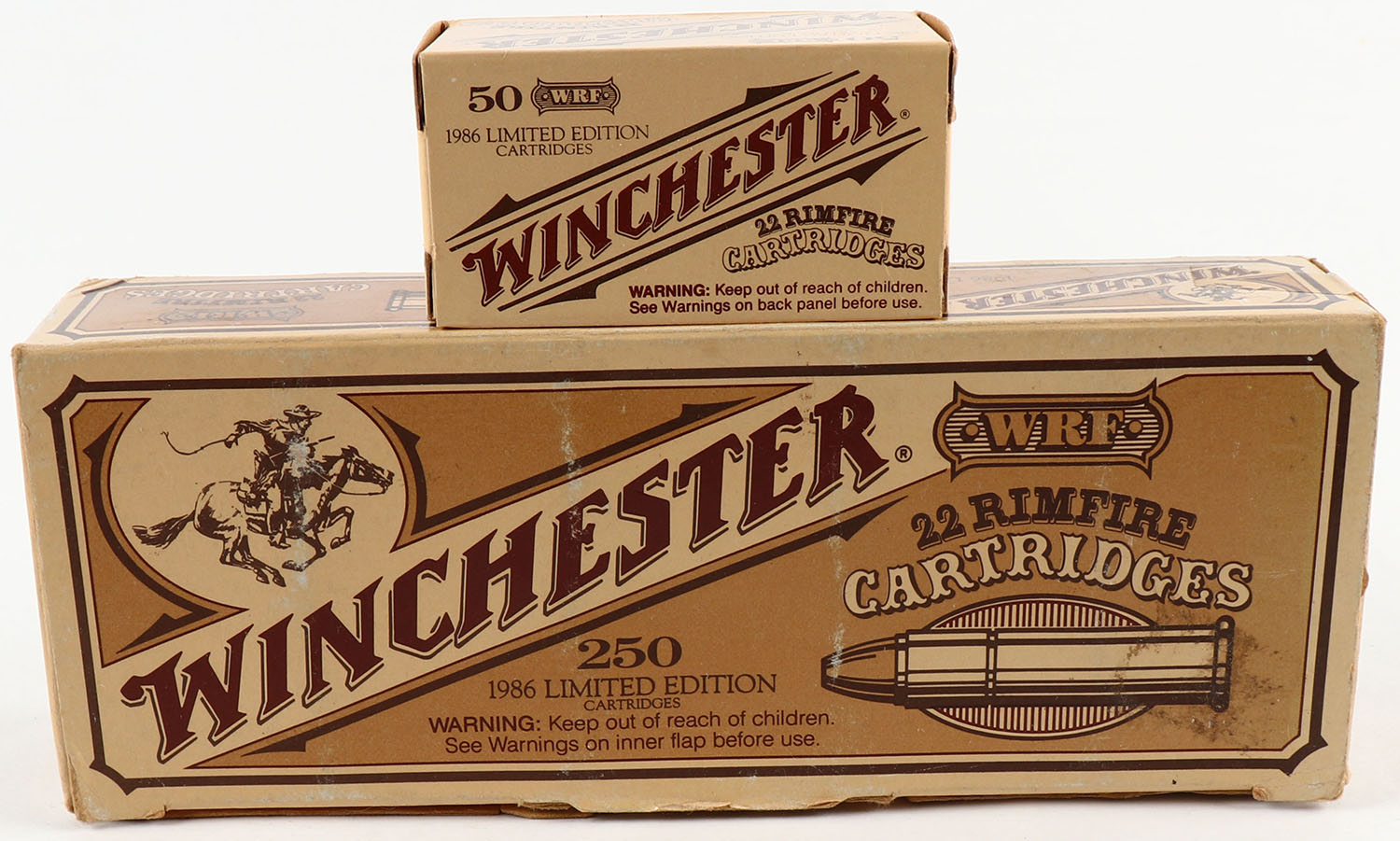 Winchester, .22 WRF, 1986 Limited Edition, Full, 250rds. 1pc. Brown & tan brick, brick is solid with excellent color, some shelf wear, minor corner wear, some tearing around top flap insert tab, edges are mostly crisp, top flap is rigid, inside boxes are mint. Grade: Excellent - Value: 50 to 150