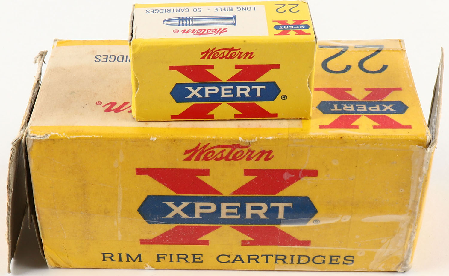 Western, Xpert, .22 Long Rifle, 40 Grain Lead, Full, 500rds., 1pc. Yellow white & red brick, brick is covered in tape, both end flaps are torn, very good color, age soiling, edge & corner wear, inside boxes are excellent to minty. Grade: Good - Value: 20 to 60